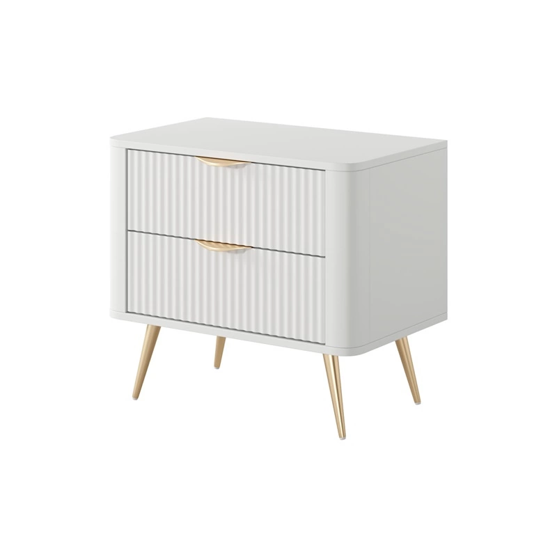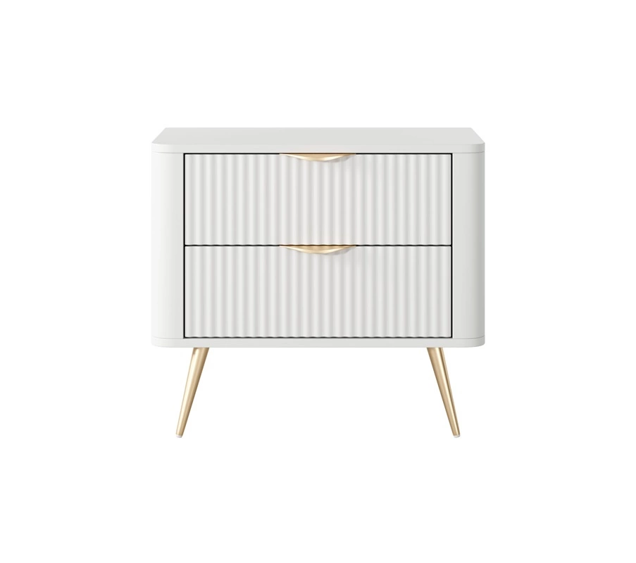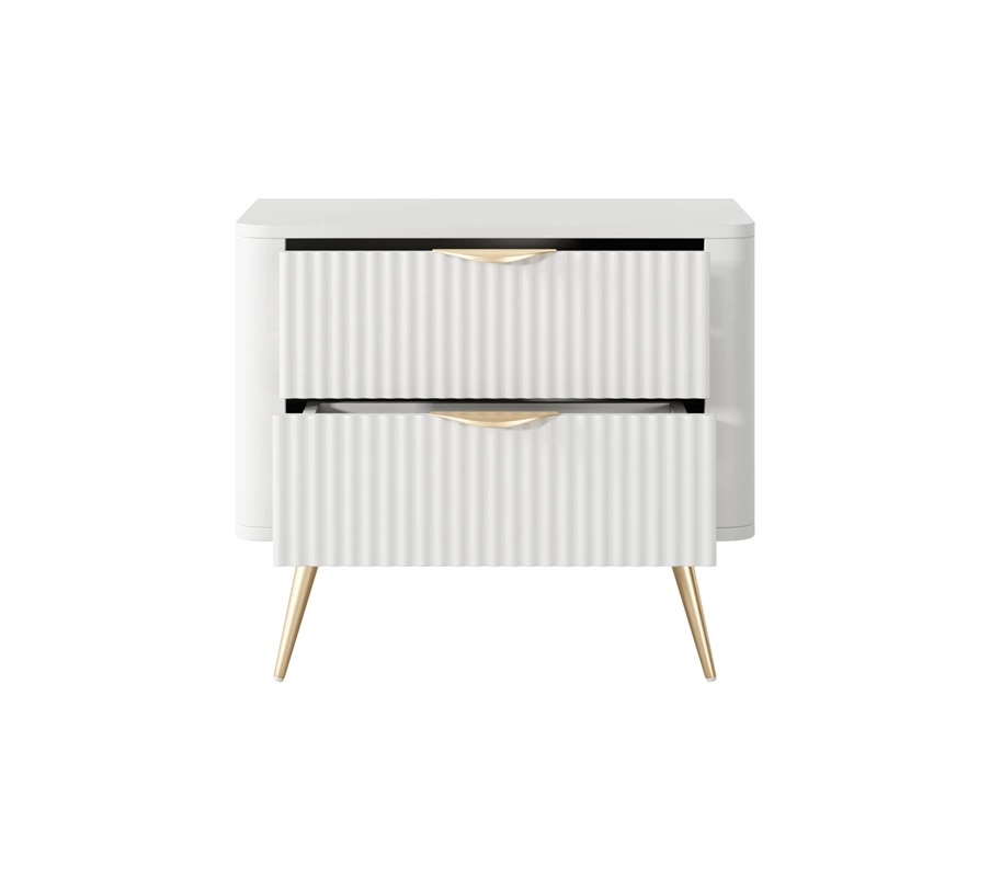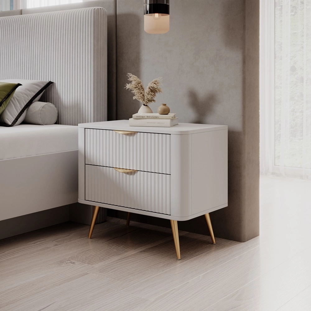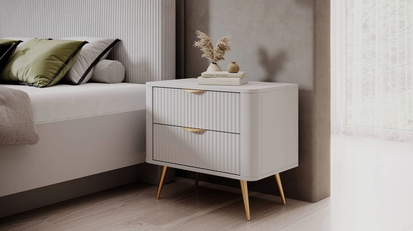 Ryflowane fronty zostały wykonane z płyty MDF. Korpus szafki nocnej wykonany jest z wysokiej jakości płyty laminowanej o grubości 16mm, która charakteryzuje się odpornością na wpływ czynników zewnętrznych takich jak obicia, uderzenia i niefortunne zadrapania. Konstrukcję mebla urozmaicono złotymi metalowymi nogami. Precyzyjne wykończenie i dbałość o detale sprawiają, że szafka nocna zachowa swój piękny wygląd na wiele lat, nie tracąc przy tym na funkcjonalności.