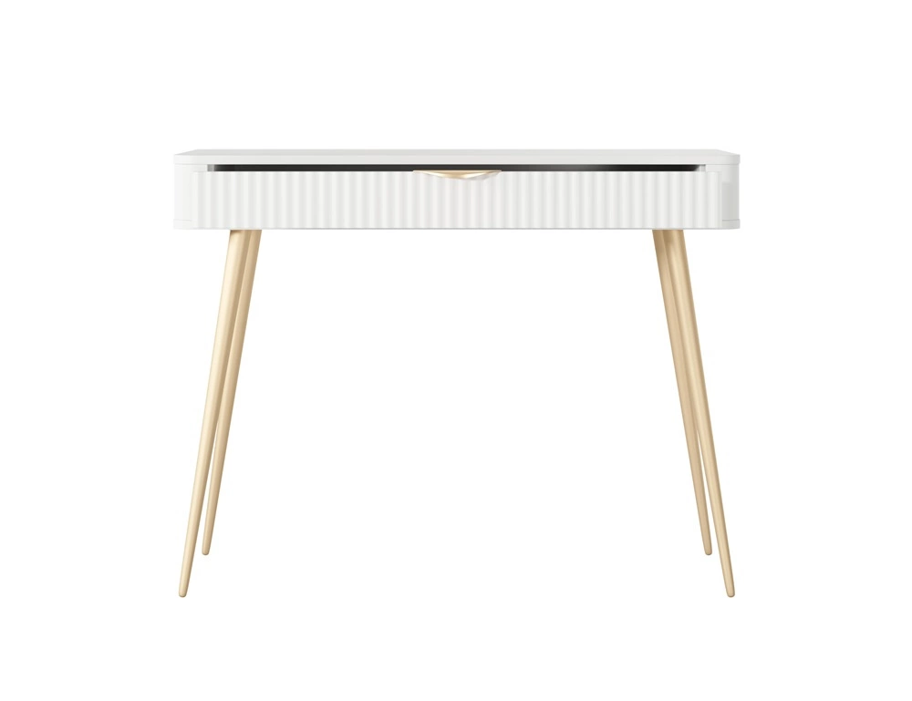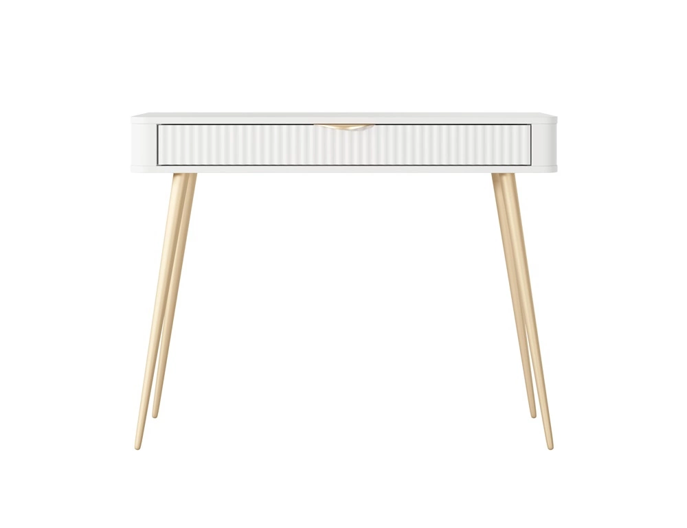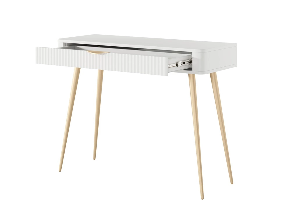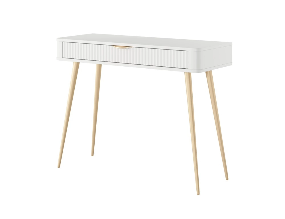 Konsola Lante biała z szufladą stylowa oraz funkcjonalna toaletka zaoblony kształt bryły ryflowany front uchwyty krawędziowe