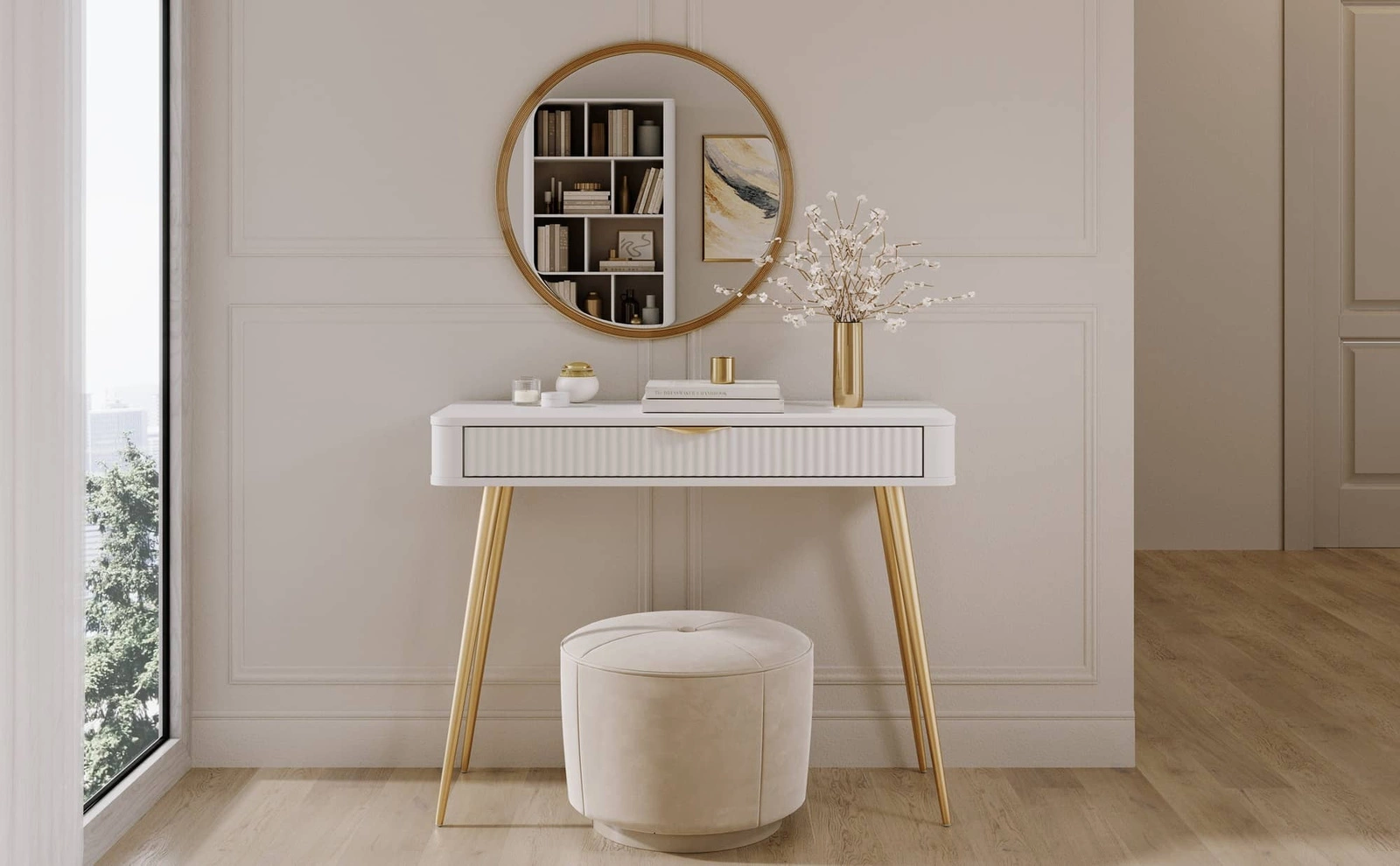 - Konsola Lante to bardzo elegancki i oryginalny mebel. Owalny kształt, ryflowane fronty oraz uchwyty krawędziowe stanowią nietuzinkowe wykończenie toaletki. Wysokie, skośne nogi w złotym kolorze sprawiają, że bryła prezentuje się niezwykle szykownie.