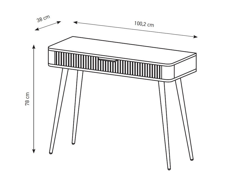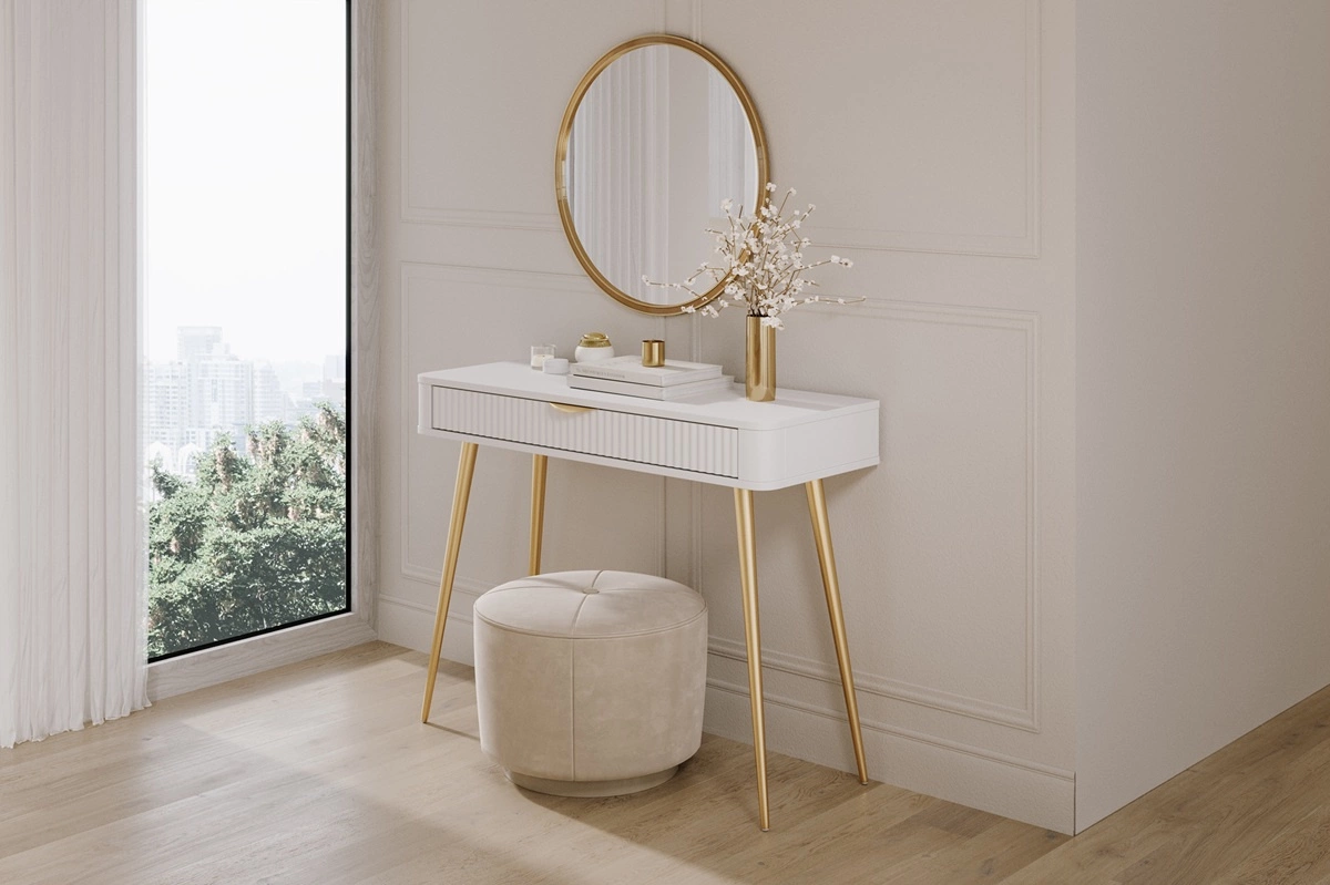 Mebel jest skonstruowany z 1 szuflady. Toaletka z szufladą gwarantuje komfortowe i bezproblemowe korzystanie oraz trwałość całego mebla przez wiele lat użytkowania. Dzięki swojej formie oraz uniwersalności konsola świetnie sprawdzi się jako toaletka, która ułatwi uporządkowanie damskich kosmetyków i drobiazgów, a także jako biurka do biura domowego.