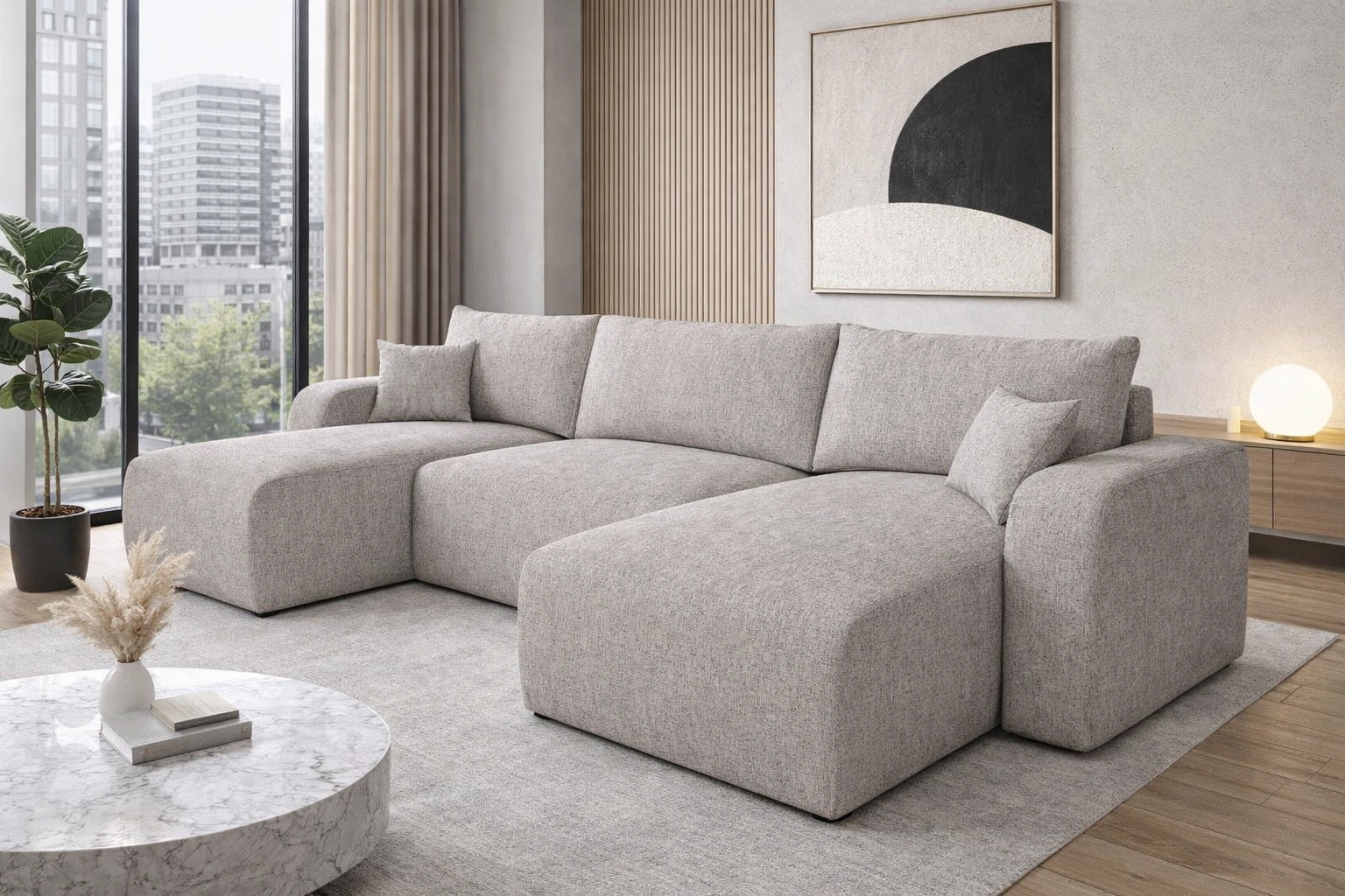 - Narożnik Fiesta U charakteryzuje się wysoką elegancją i komfortem. Połączenie minimalistycznej konstrukcji z obłymi kształtami dodaje nietuzinkowego wyglądu. Dużym atutem bryły jest wytrzymała pleciona tkanina oraz prosty w obsłudze system rozkładania.