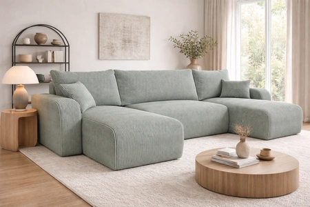 • Narożnik Fiesta U charakteryzuje się wysoką elegancją i komfortem. Połączenie minimalistycznej konstrukcji z obłymi kształtami dodaje nietuzinkowego wyglądu. Miękka sztruksowa tkanina o wyrazistych prążkach oraz prosty w obsłudze system rozkładania.