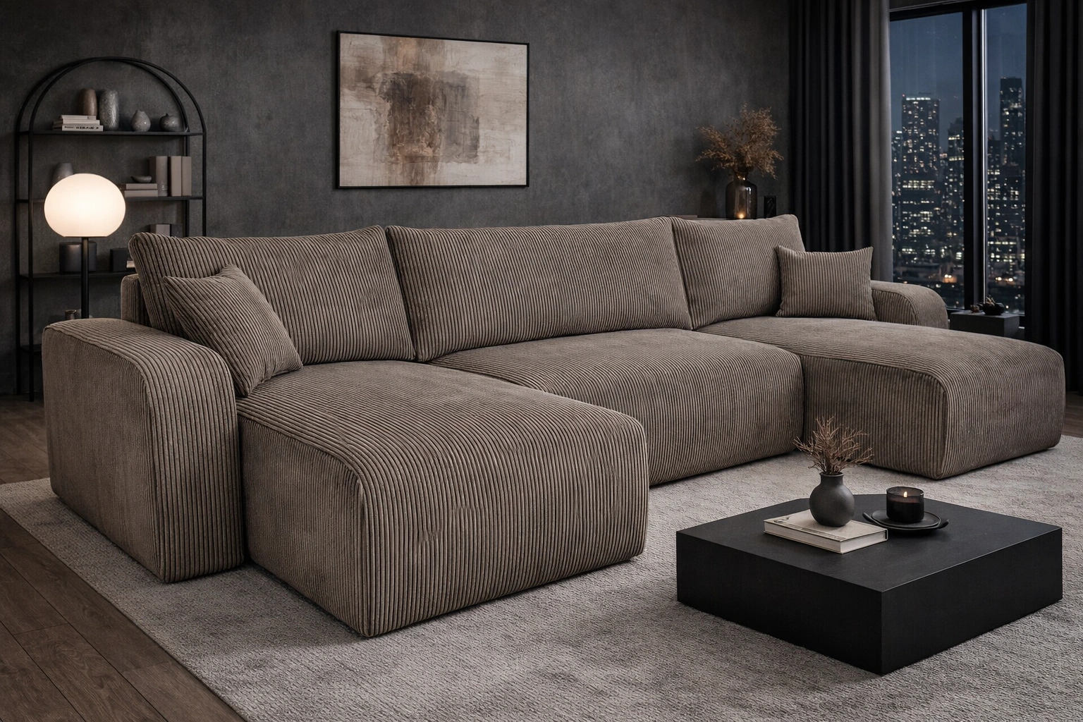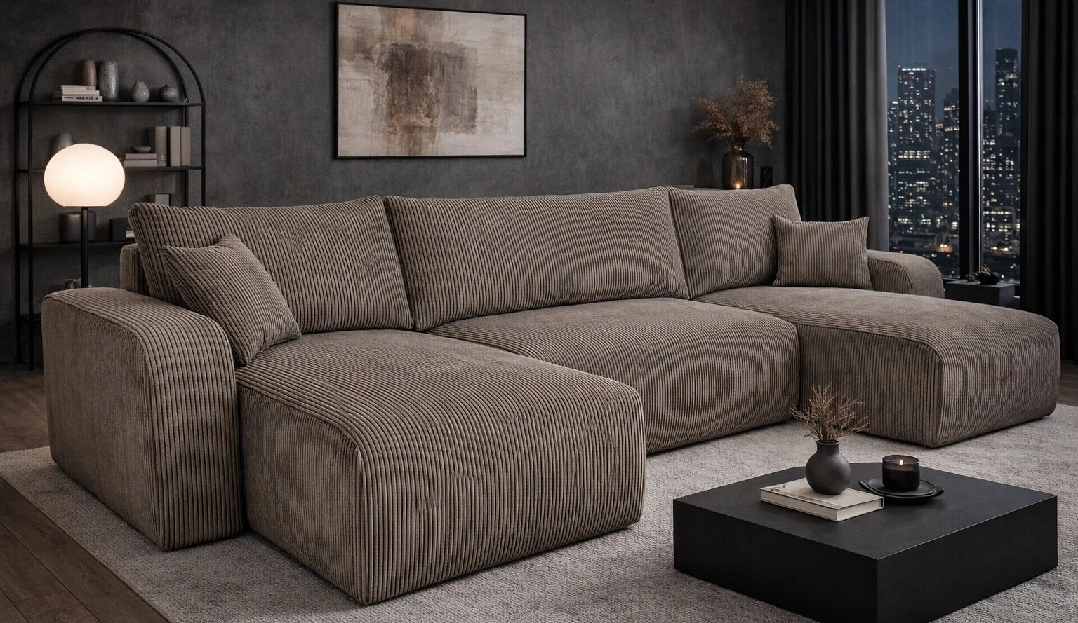 • Narożnik Fiesta U XL charakteryzuje się wysoką elegancją i komfortem. Połączenie minimalistycznej konstrukcji z obłymi kształtami dodaje nietuzinkowego wyglądu. Miękka sztruksowa tkanina o wyrazistych prążkach oraz prosty w obsłudze system rozkładania.