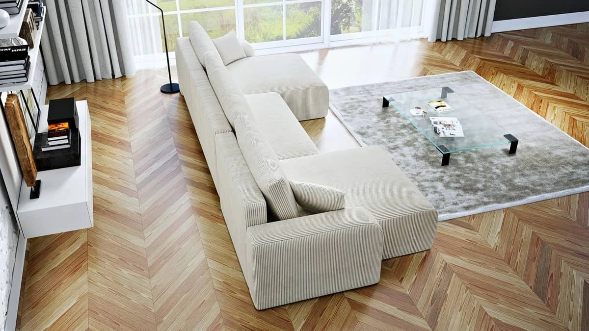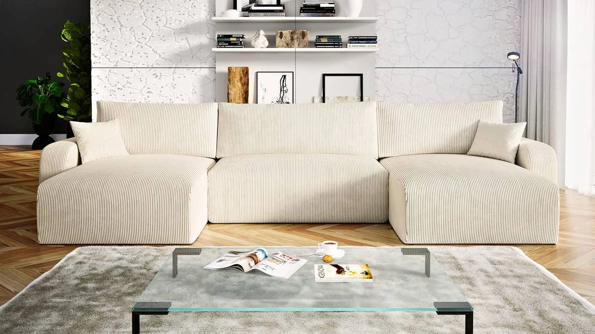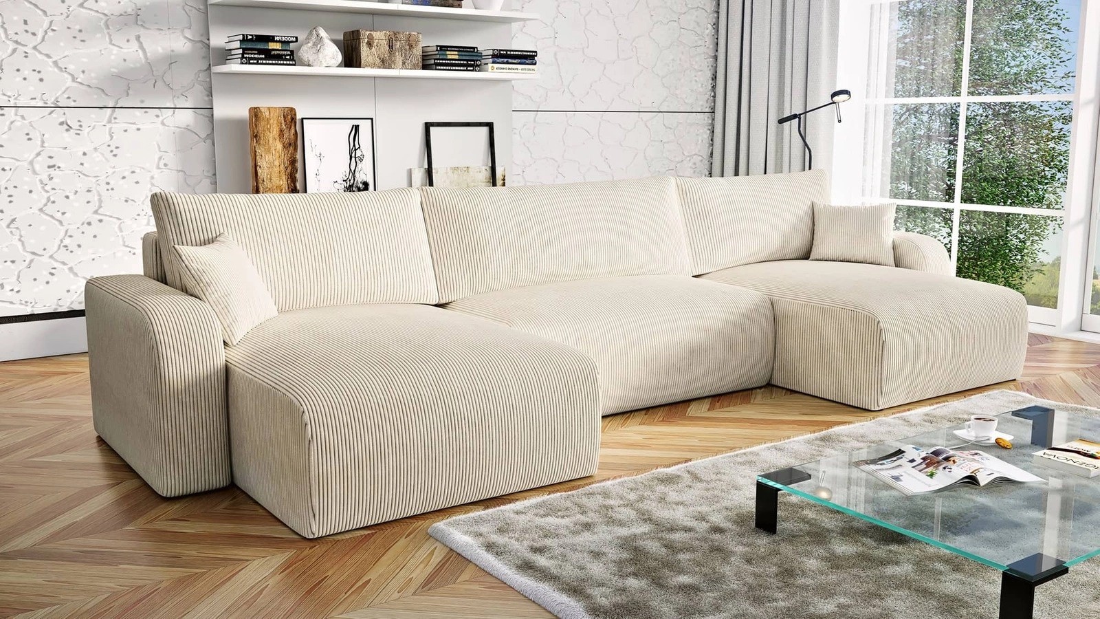 Narożnik z funkcją spania Fiesta U XL beżowy elegancki narożnik do salonu z pojemnikiem na pościel sztruksowa tkanina