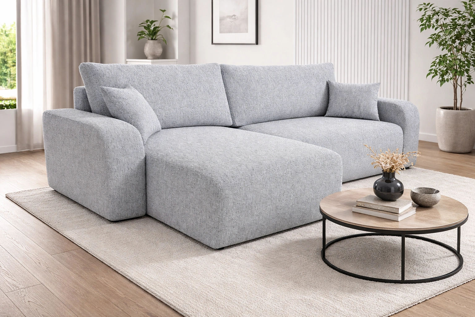 Tkanina Neve wyróżnia się wysoką odpornością na płowienie, co idealnie sprawdza się przy bardzo nasłonecznionych aranżacjach wnętrz. Mocny i wytrzymały, a przy tym niezwykle przyjemny w dotyku pleciony materiał jest również łatwy do utrzymania w czystości. Klasyczna pleciona faktura w połączeniu z efektem melanżu nadaje meblom wyjątkowej głębi i elegancji. Kolejną zaletą tkaniny Neve jest wysoka odporność na ścieranie. Dzięki temu narożnik rozkładany Fiesta XL przez długi czas będzie wyglądał estetycznie i elegancko. Narożnik z funkcją spania codziennego wykonany został z wysokiej jakości materiałów, które charakteryzują się odpornością na wpływ czynników zewnętrznych takich jak obicia mebla oraz różnego typu uderzenia.
