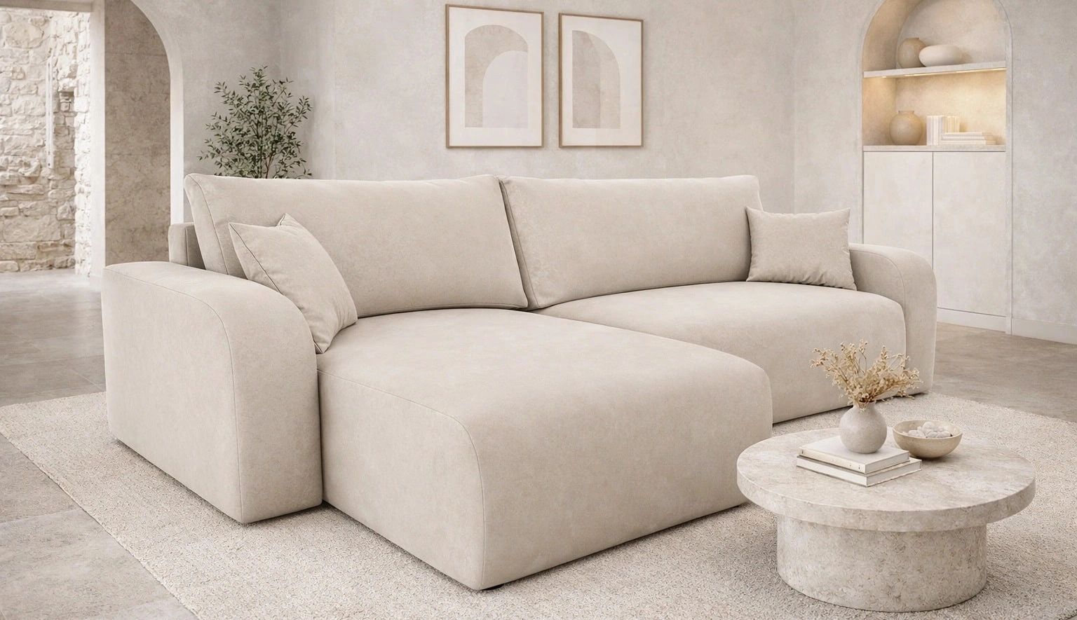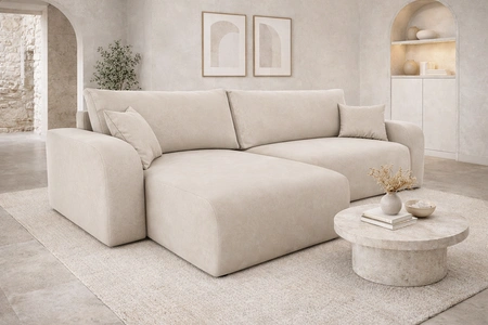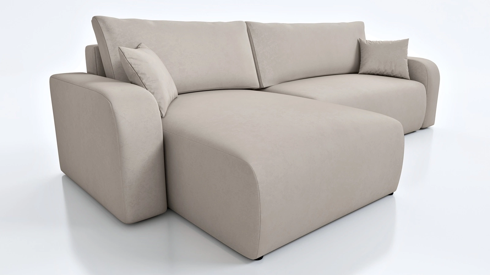 Narożnik z funkcją spania Fiesta XL jasny beż uniwersalny w ustawieniu narożnik z pojemnikiem na pościel miękka pluszowa tkanina