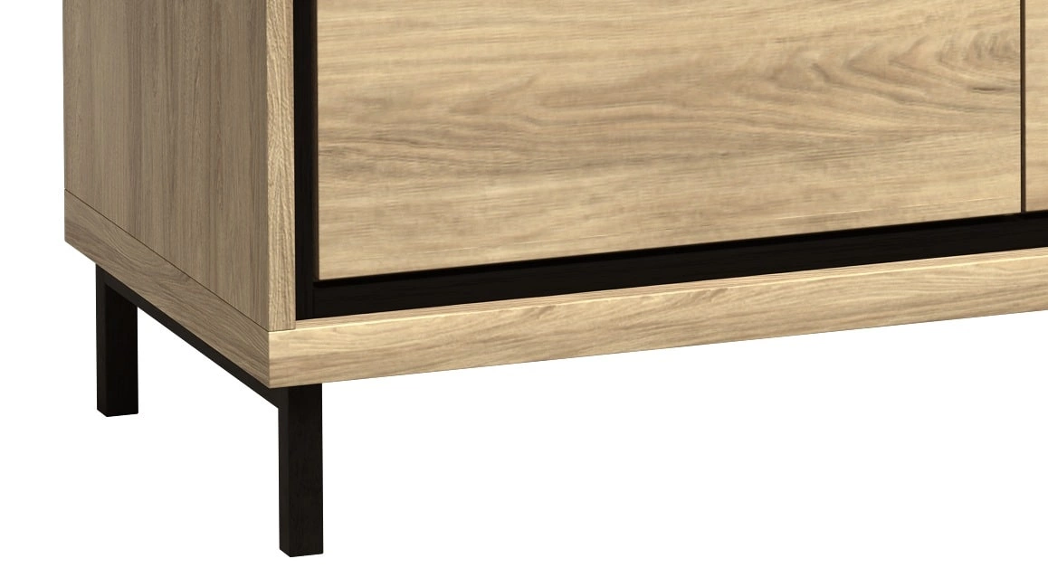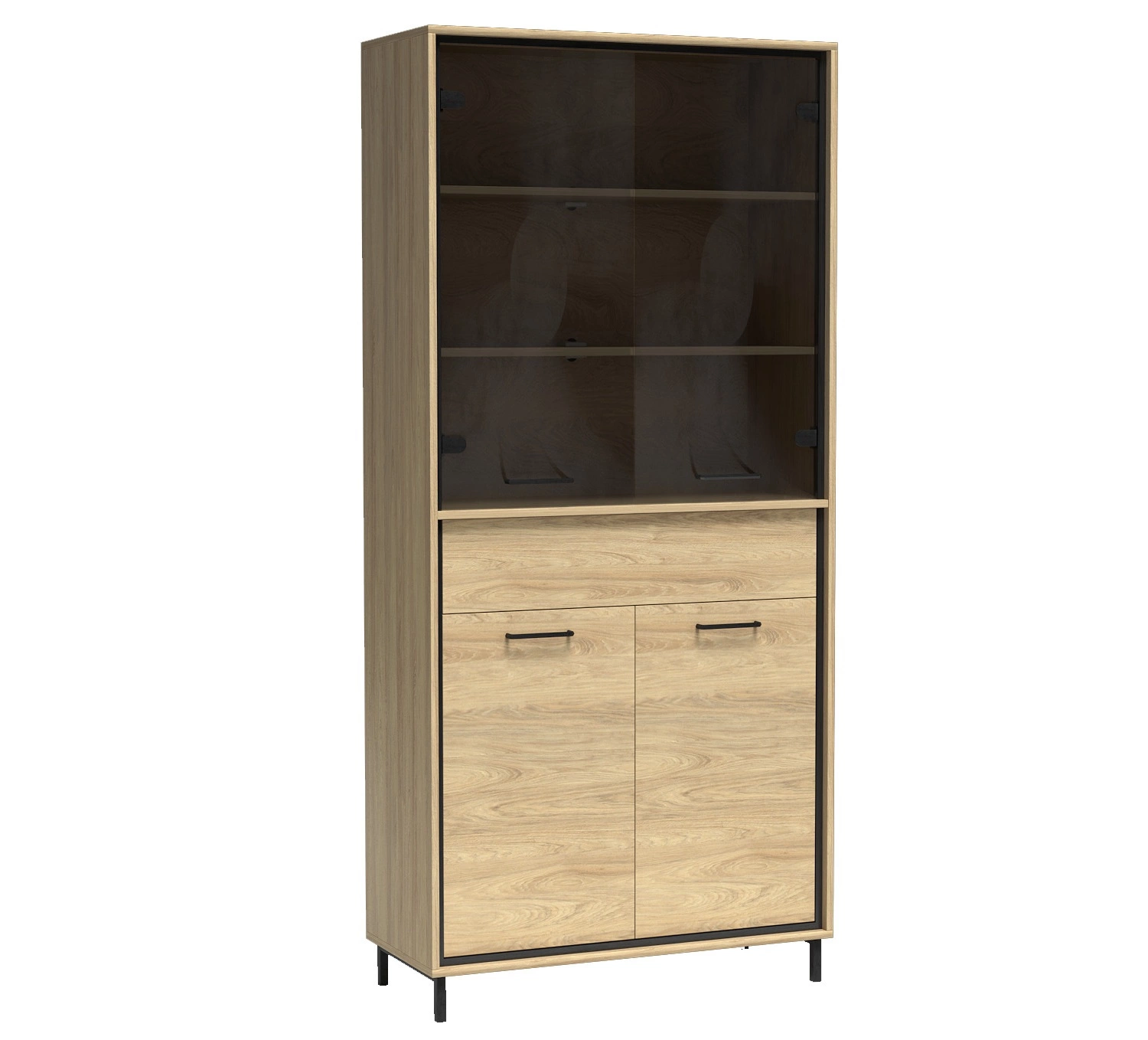 Witryna z szufladą Mediolan Plus łączy w sobie funkcjonalność z niezwykle wyjątkowym designem. Ciekawe zestawienie ciepłego dekoru hikora z wstawkami w kolorze czarnym nadaje meblom nowoczesnego wyglądu i kontrastu. Prosta konstrukcja, delikatnie przydymione szkło oraz fronty o gładkim wykończeniu umieszczone na czarnych, wysokich nogach stanowią oryginalną i niebanalną dekorację. Dopełnieniem frontów witryny są czarne wykończenia w postaci listew, które idealnie pasują do czarnych metalowych uchwytów. Designerska konstrukcja witryny idealnie koresponduje z aktualnymi trendami wnętrzarskimi dzięki czemu meble z kolekcji Mediolan Plus łatwo zaaranżować w salonie, jadalni lub w gabinecie.
