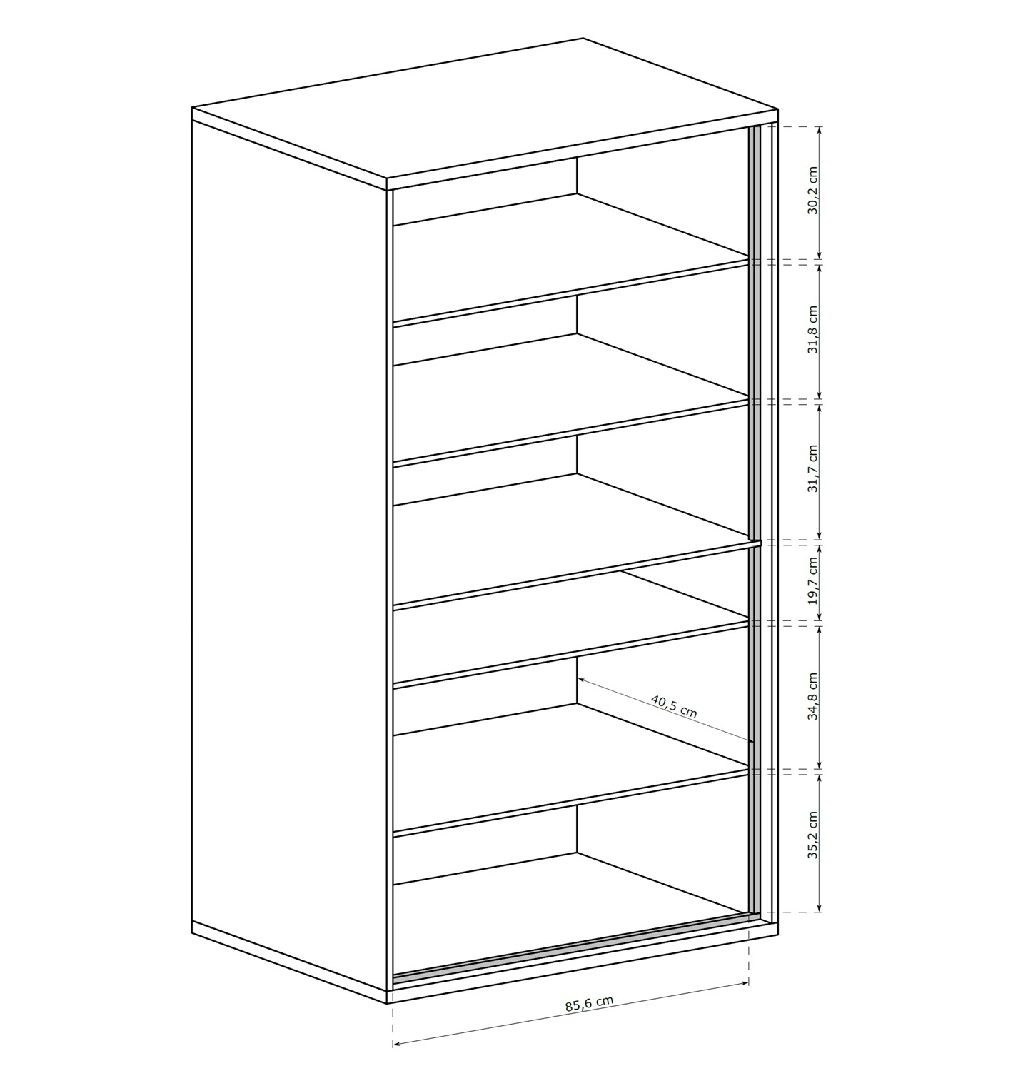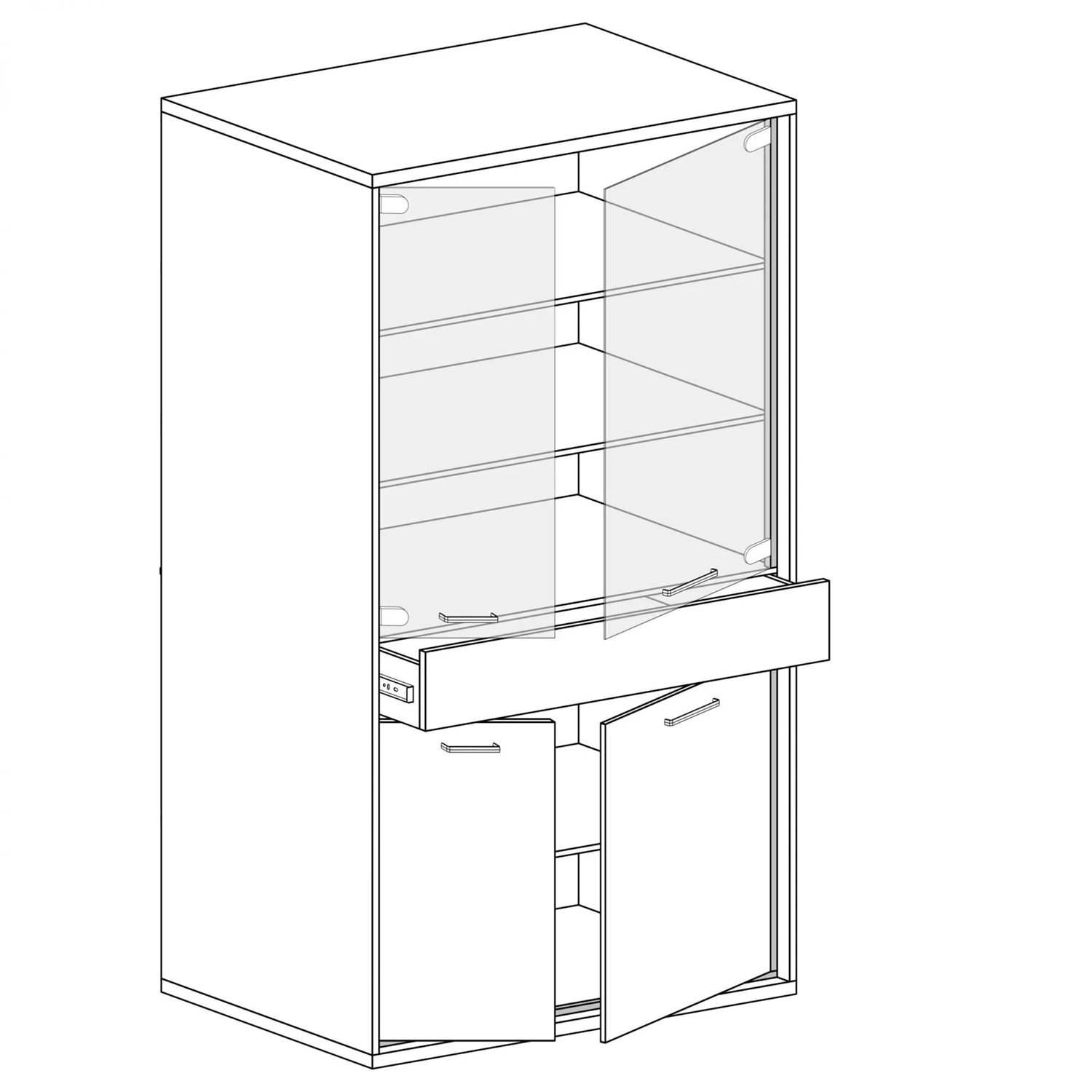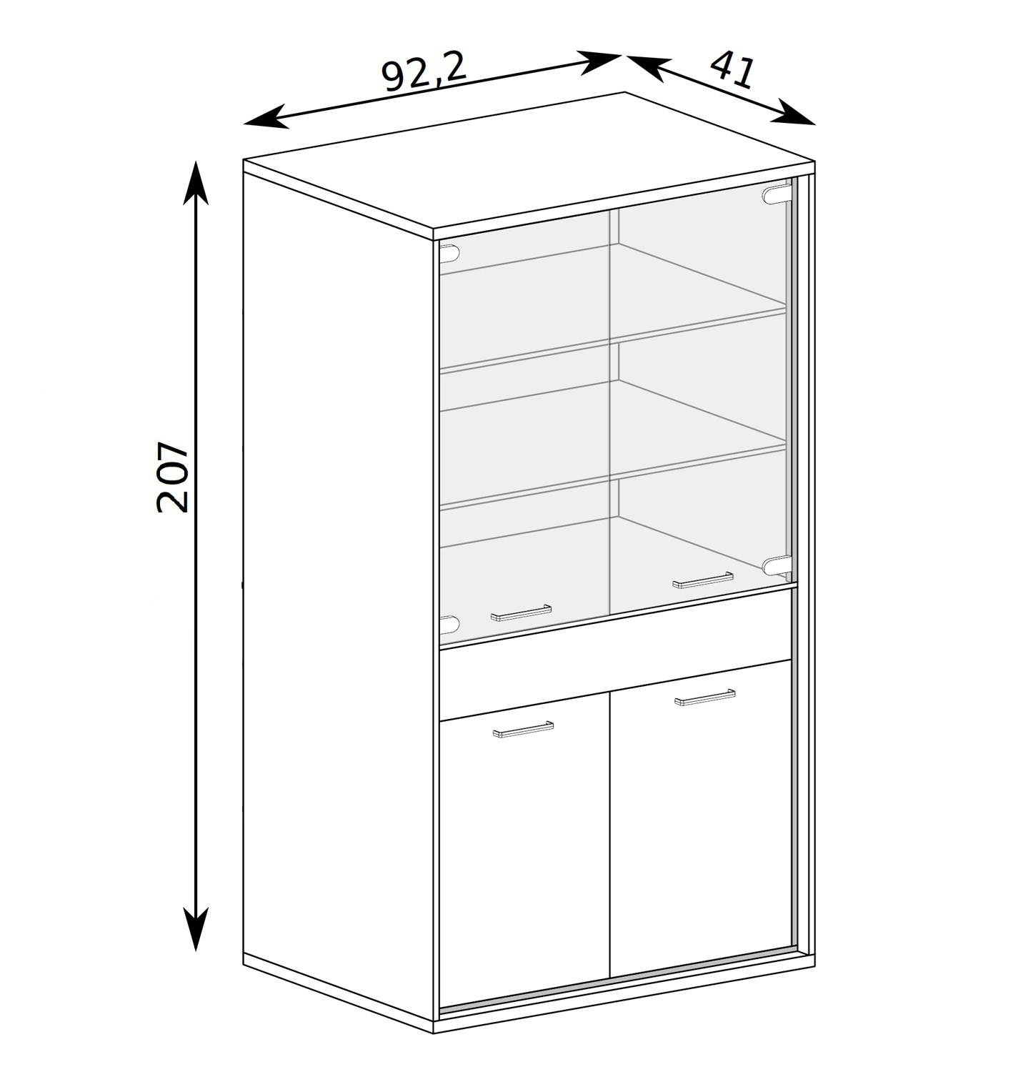 Witryna jest skonstruowana z 4 drzwi oraz 1 szuflady. Standardowym wyposażeniem są zawiasy oraz prowadnice szuflad z systemem cichego domykania. Zastosowany system zwiększa komfort i bezpieczeństwo użytkowania mebli. Witryna wykonana została z wysokiej jakości płyty laminowanej, która charakteryzuje się odpornością na wpływ czynników zewnętrznych takich jak obicia, uderzenia i niefortunne zadrapania. Dzięki prostej formie oraz uniwersalności witryny szklane Mediolan Plus świetnie sprawdzą się w roli witryny do salonu, witryny do pokoju dziennego lub witryny do jadalni, a także witryny na książki.