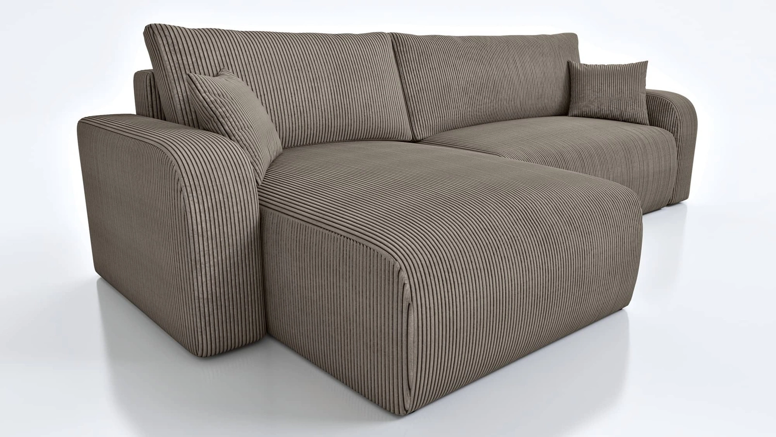 Trójwymiarowa sztruksowa tkanina o wyrazistych i grubych prążkach nadaje szczególnego charakteru oraz wyjątkowej urody. Tkanina jest bardzo miękka, a przy tym mocna i wytrzymała. Tkanina obiciowa Poso jest odporna na ścieranie, a także łatwa do utrzymania w czystości. Dzięki temu narożnik rozkładany Fiesta XL przez długi czas będzie wyglądał estetycznie i elegancko. Narożnik z funkcją spania codziennego wykonany został z wysokiej jakości materiałów, które charakteryzują się odpornością na wpływ czynników zewnętrznych takich jak obicia mebla oraz różnego typu uderzenia.