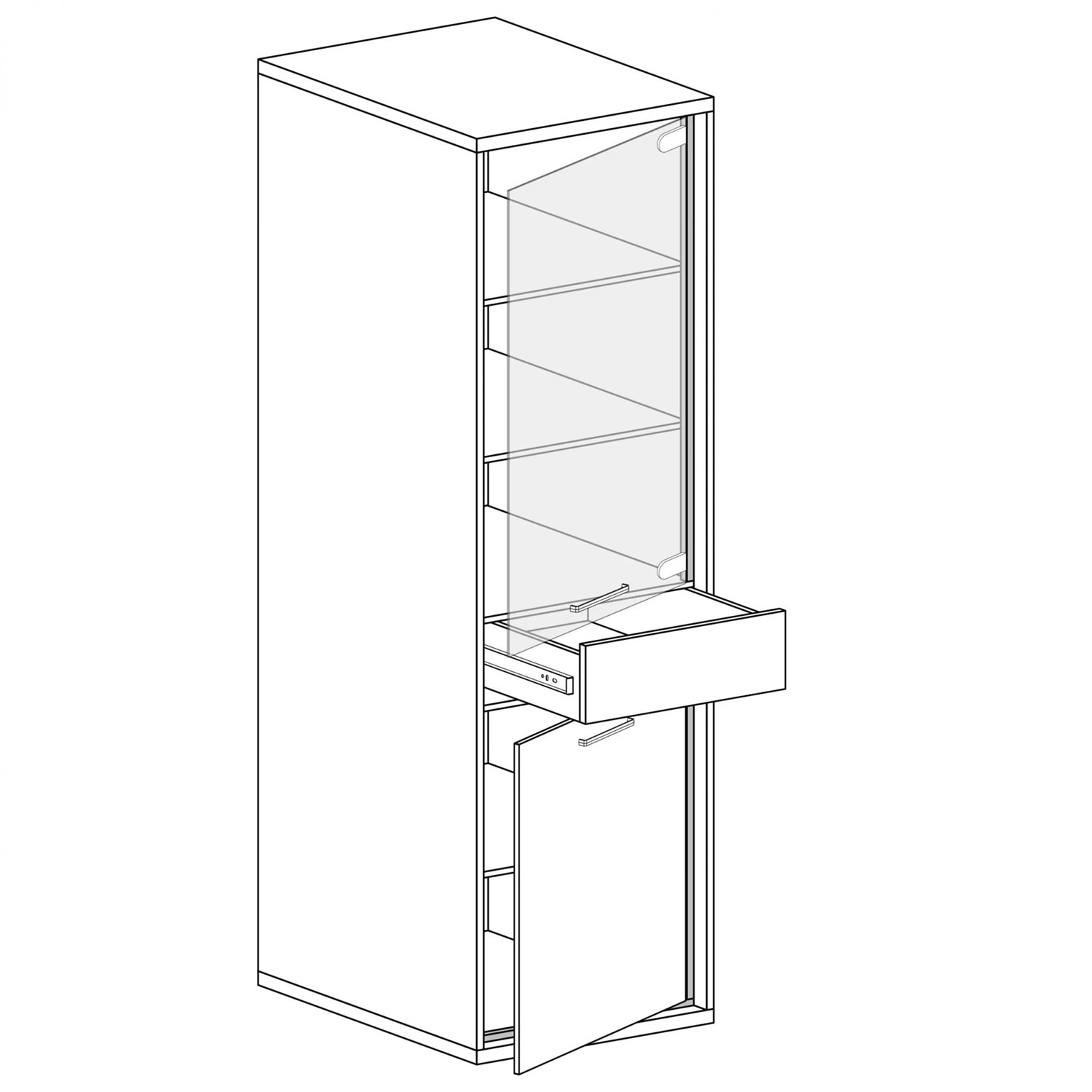 Witryna jest skonstruowana z 2 drzwi oraz 1 szuflady. Standardowym wyposażeniem są zawiasy oraz prowadnice szuflad z systemem cichego domykania. Zastosowany system zwiększa komfort i bezpieczeństwo użytkowania mebli. Witryna wykonana została z wysokiej jakości płyty laminowanej, która charakteryzuje się odpornością na wpływ czynników zewnętrznych takich jak obicia, uderzenia i niefortunne zadrapania. Dzięki prostej formie oraz uniwersalności witryny szklane Mediolan Plus świetnie sprawdzą się w roli witryny do salonu, witryny do pokoju dziennego lub witryny do jadalni, a także witryny na książki.