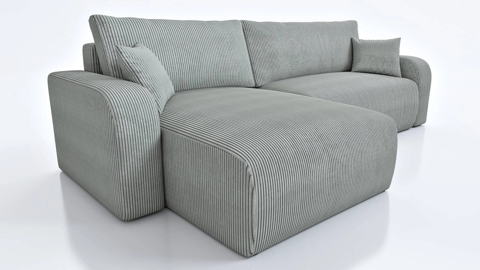 Trójwymiarowa sztruksowa tkanina o wyrazistych i grubych prążkach nadaje szczególnego charakteru oraz wyjątkowej urody. Tkanina jest bardzo miękka, a przy tym mocna i wytrzymała. Tkanina obiciowa Poso jest odporna na ścieranie, a także łatwa do utrzymania w czystości. Dzięki temu narożnik rozkładany Fiesta XL przez długi czas będzie wyglądał estetycznie i elegancko. Narożnik z funkcją spania codziennego wykonany został z wysokiej jakości materiałów, które charakteryzują się odpornością na wpływ czynników zewnętrznych takich jak obicia mebla oraz różnego typu uderzenia.