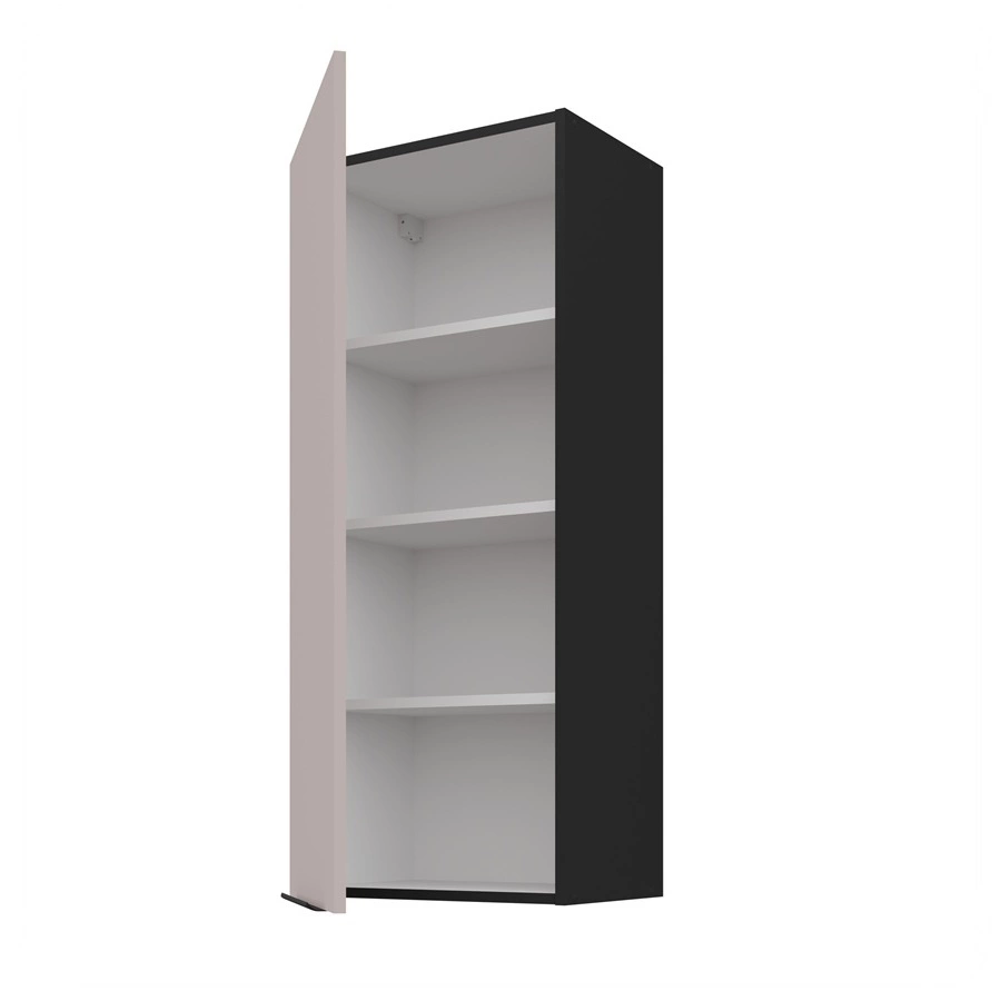 Dwie półki można wyciągnąć i uzyskać miejsce na wysokie przedmioty. Drzwi są uniwersalne i można je zamontować po prawej lub po lewej stronie. Standardowym wyposażeniem szafki kuchennej są zawiasy z systemem cichego domykania. Spowalniacze zwiększają komfort i bezpieczeństwo użytkowania mebli.
