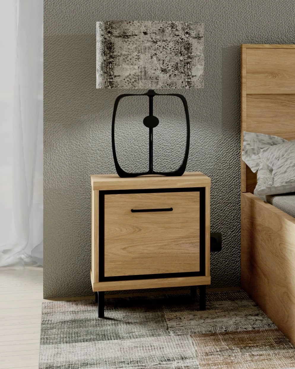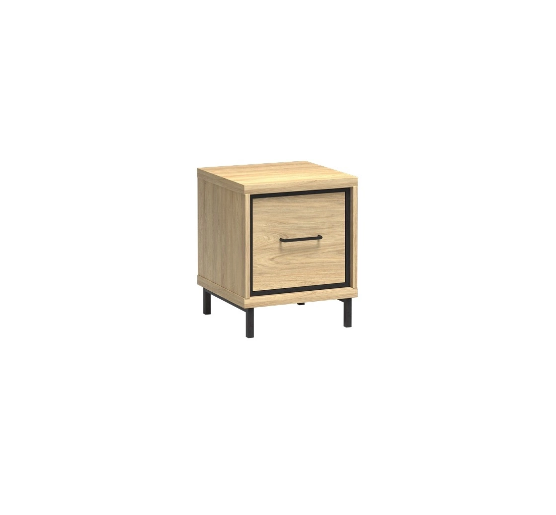 Szafka nocna Mediolan Plus hikora elegancki design szafki z metalowymi nogami wzbogacony o stylowe czarne dodatki idealna szafka nocna do sypialni