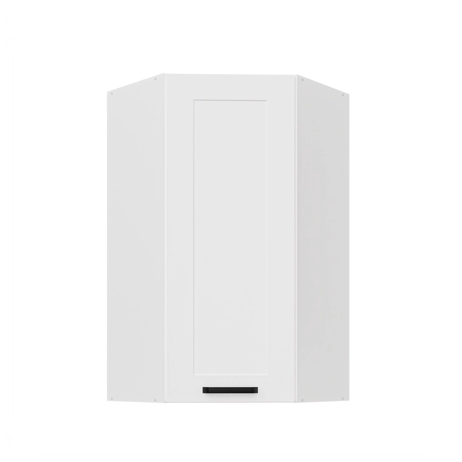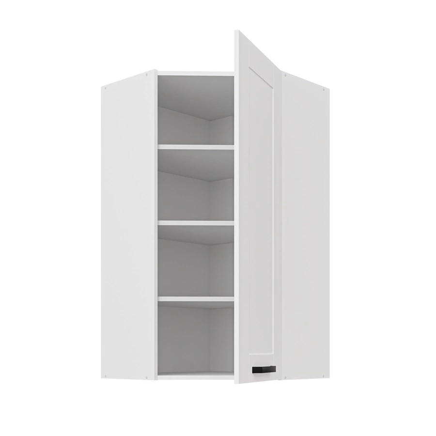 Szafka kuchenna narożna wisząca Livio w kolorze białym należy do kategorii mebli kuchennych modułowych, z których można utworzyć dowolne zestawy.