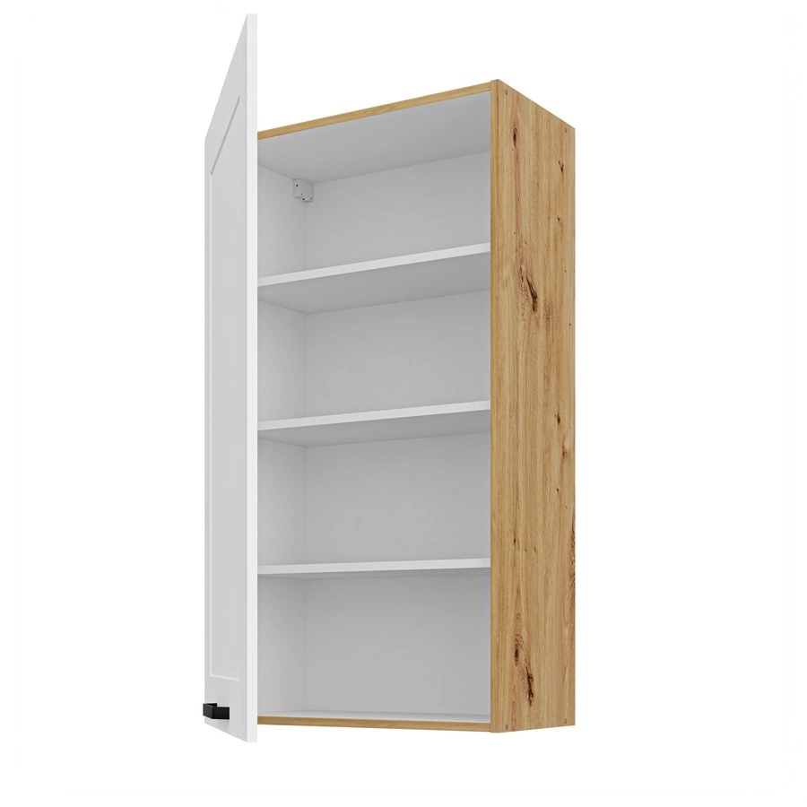 Dwie półki można wyciągnąć i uzyskać miejsce na wysokie przedmioty. Drzwi są uniwersalne i można je zamontować po prawej lub po lewej stronie. Standardowym wyposażeniem szafki kuchennej są zawiasy z systemem cichego domykania. Spowalniacze zwiększają komfort i bezpieczeństwo użytkowania mebli.