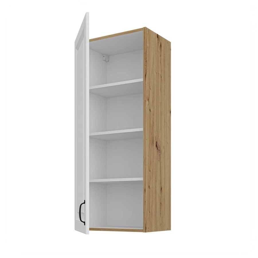 Wnętrze szafki kuchennej jest podzielone na cztery części. Trzy półki można wyciągnąć tworząc miejsce na wysokie przedmioty. Drzwi są uniwersalne i można je zamontować po prawej lub po lewej stronie. Standardowym wyposażeniem szafki kuchennej są zawiasy z systemem cichego domykania. Spowalniacze zwiększają komfort i bezpieczeństwo użytkowania mebli.