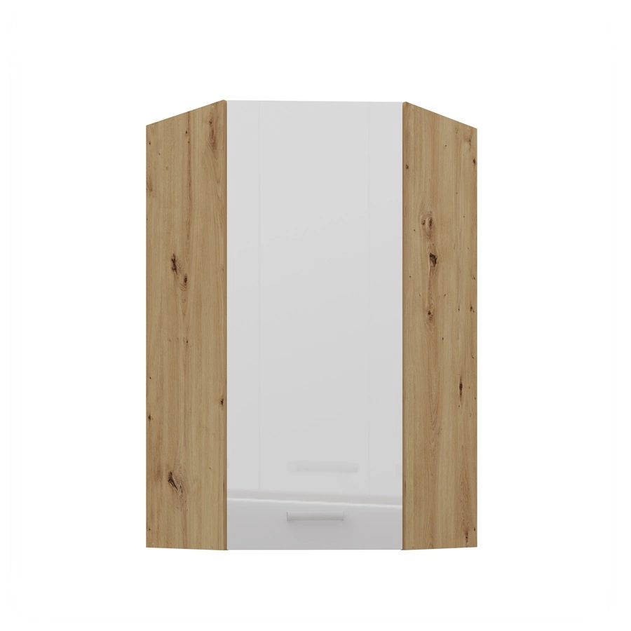Szafka kuchenna narożna wisząca Alpine w kolorze biały / dąb artisan należy do kategorii mebli kuchennych modułowych, z których można utworzyć dowolne zestawy.