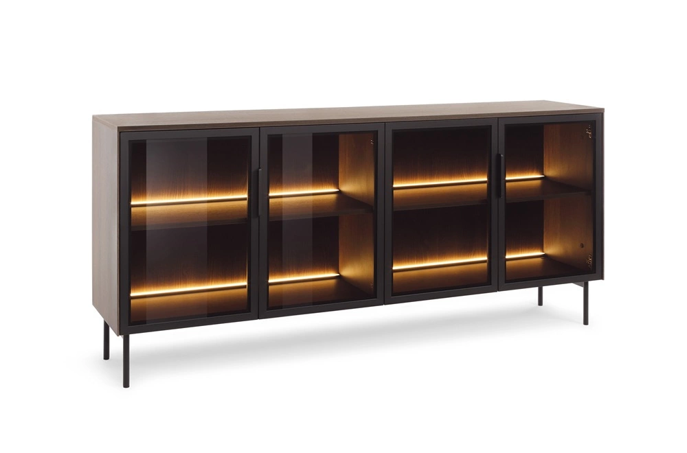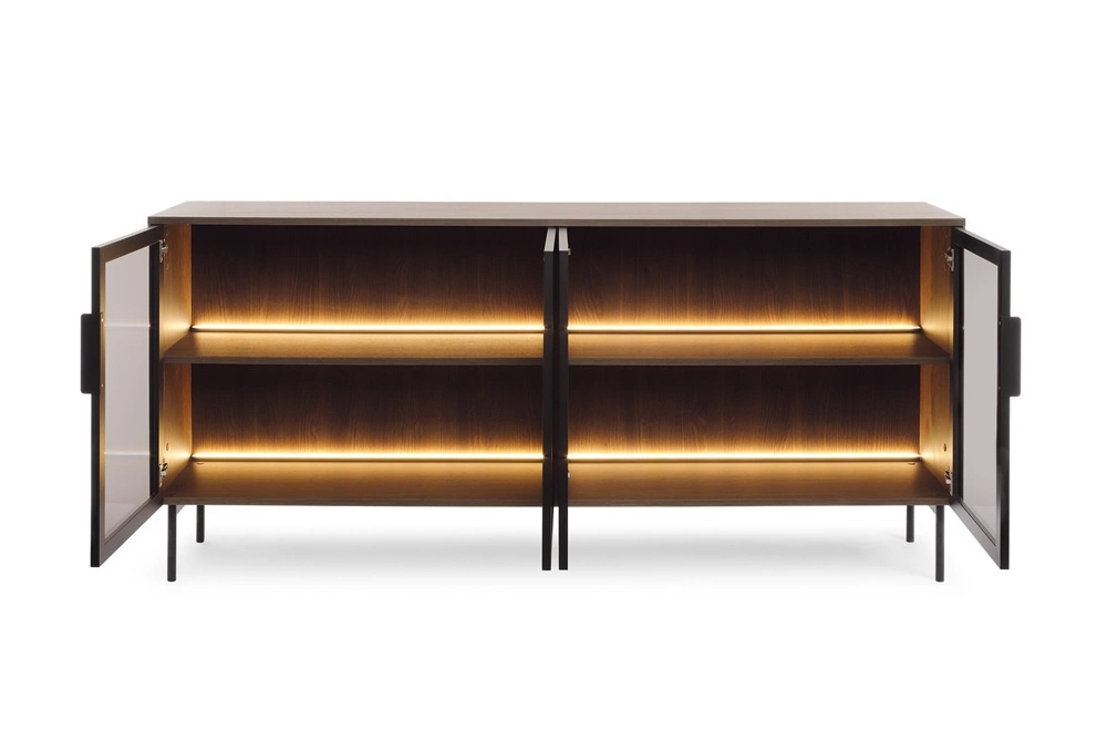 Komoda z kolekcji Lumi to nowoczesny mebel utrzymany w prostym, a zarazem oryginalnym stylu. Głównym elementem przyciągającym wzrok są przeszklone fronty wykończone szkłem antisol, które podkreśla subtelne oświetlenie LED. Zdecydowany odcień dębu dunin przekształci mieszkanie w oazę elegancji, świeżości i harmonii. Całości dopełniają wysokie, smukłe nogi oraz czarne uchwyty krawędziowe podkreślające elegancką stylistykę komody. Unikatowe wzornictwo komody spełni oczekiwania miłośników odważnych, a także wyrafinowanych aranżacji.
