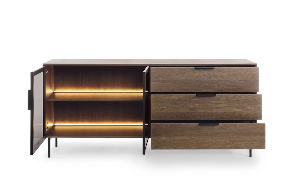 Komoda z szufladami Lumi 181 cm dąb dunin stylowa komoda z designerskimi przeszklonymi frontami metalowa podstawa i uchwyty krawędziowe