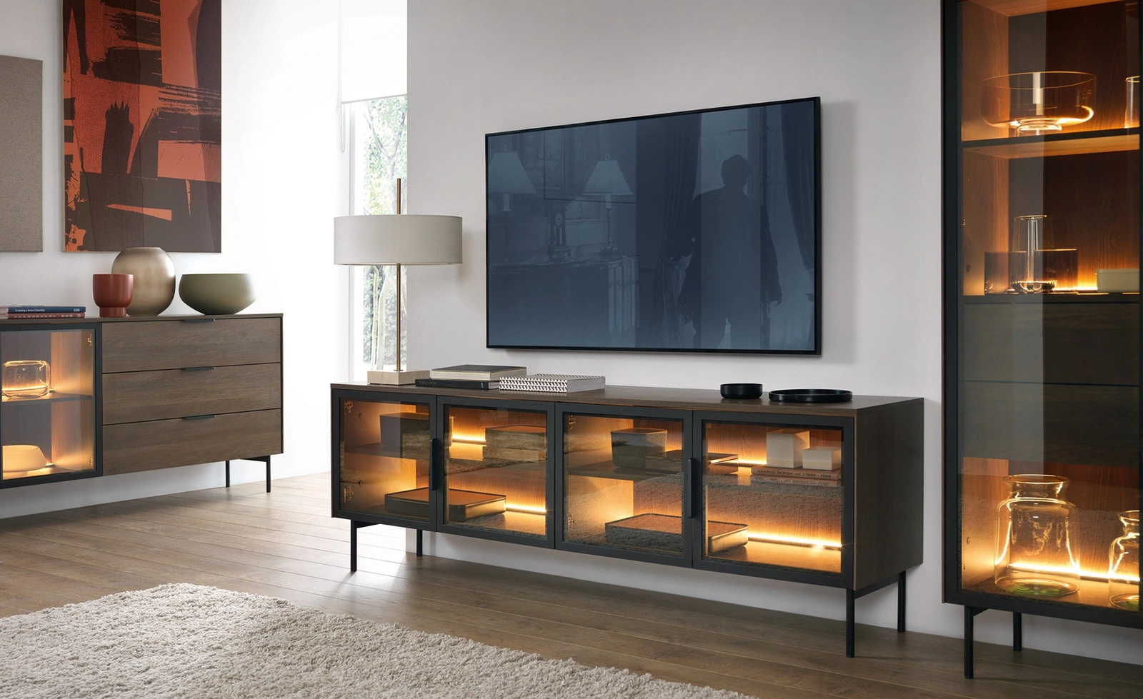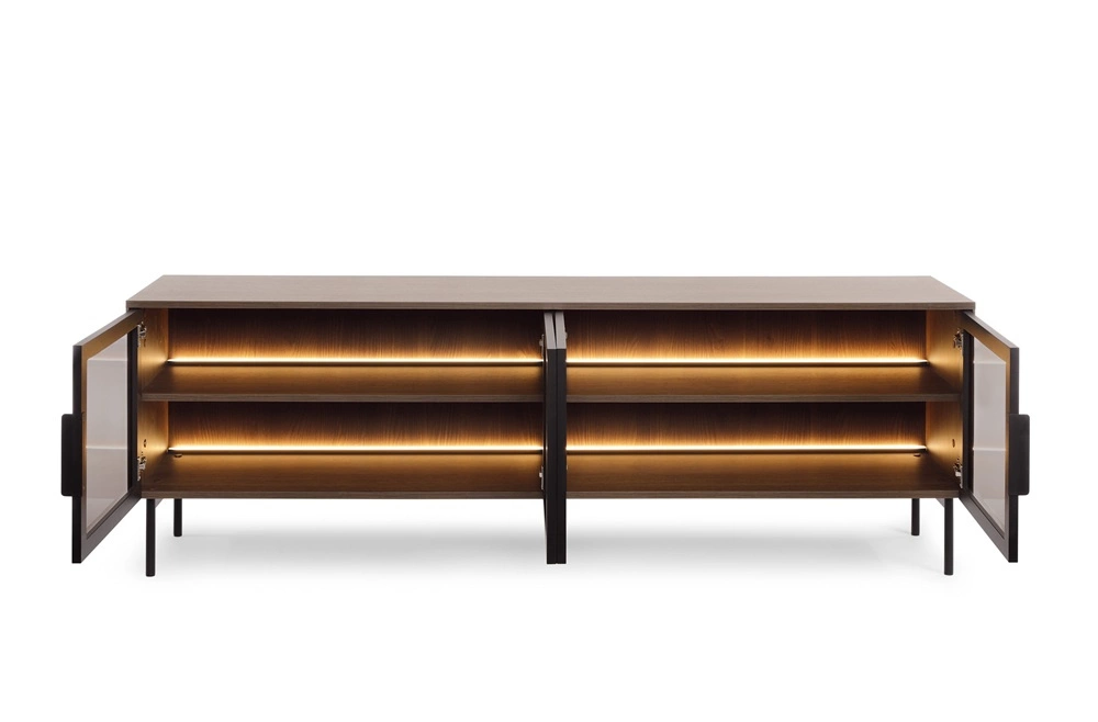 Szafka RTV Lumi 181 cm dąb dunin designerska stylistyka szafki pod telewizor z przeszklonymi frontami i klimatycznym oświetleniem ledowym
