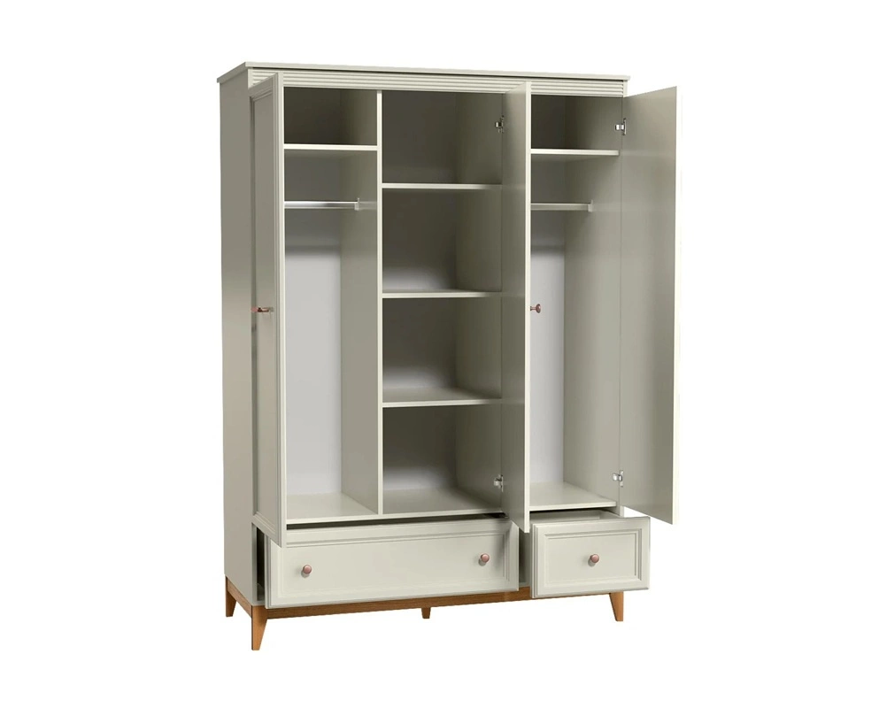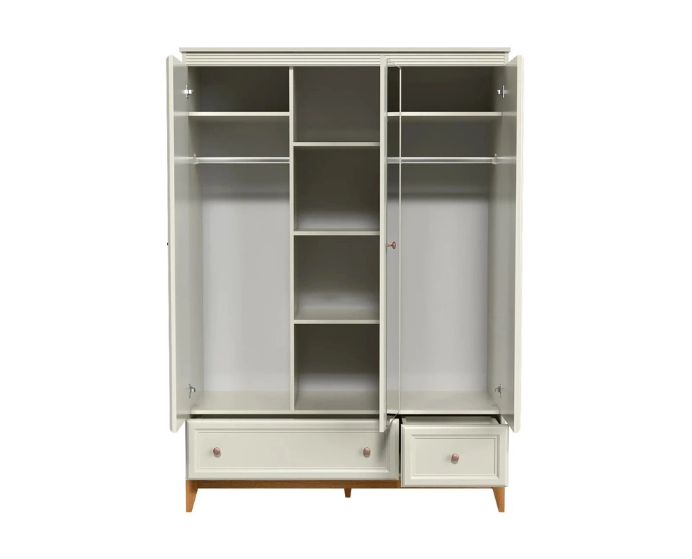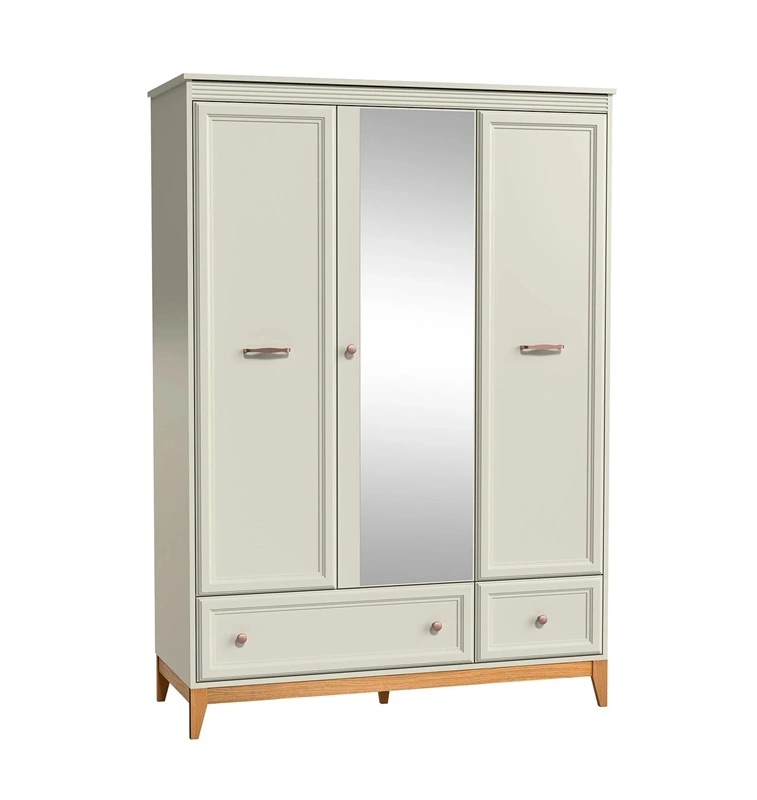 Delikatne frezowania i ozdobne listwy wykonane z płyty MDF nadają szafie wyjątkowego uroku. Stabilne nogi z litego dębowego drewna gwarantują trwałość i naturalne piękno. Stylowe, metalowe uchwyty to elegancki detal, który idealnie współgra z ciepłym kolorem korpusu. Szafa do sypialni wyposażona jest w system cichego domykania drzwi i szuflad. Zastosowany system zwiększa komfort codziennego użytkowania. Szafa Windsor dzieli się na dwie części z drążkiem i przestrzeń z półkamiPojemne szuflady pomieszczą wszystkie rzeczy oraz niezbędne akcesoria. Środkowe drzwi zostały wykończone dużym lustrem.