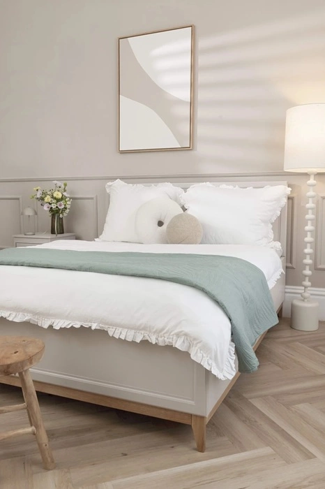 Łóżko z pojemnikiem Windsor to połączenie ponadczasowego stylu z funkcjonalnością, które wprowadzi do każdego wnętrza harmonię i elegancję. Subtelne frezowania na ramie i zagłówku oraz doskonale dobrane proporcje nadają meblom wyjątkowego charakteru. Naturalne drewniane akcenty ocieplają przestrzeń, tworząc przytulne, a jednocześnie stylowe wnętrze. Delikatny kaszmirowy odcień kolekcji Windsor sprawia, że doskonale komponuje się zarówno w klasycznych aranżacjach, jak i tych w stylu modern classic.