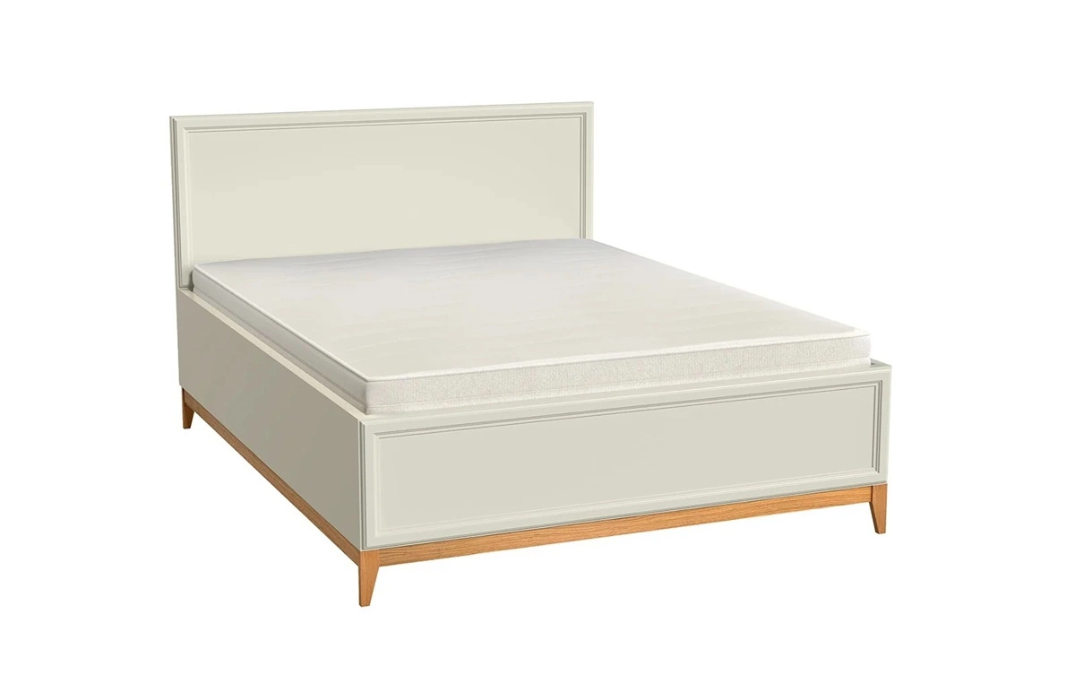 Delikatne frezowania i ozdobne listwy wykonane z płyty MDF nadają wyjątkowego uroku. Stabilne nogi z litego dębowego drewna gwarantują trwałość i naturalne piękno. Łóżko wyposażone jest w metalowy stelaż pod materac oraz przestronny pojemnik na pościel.
