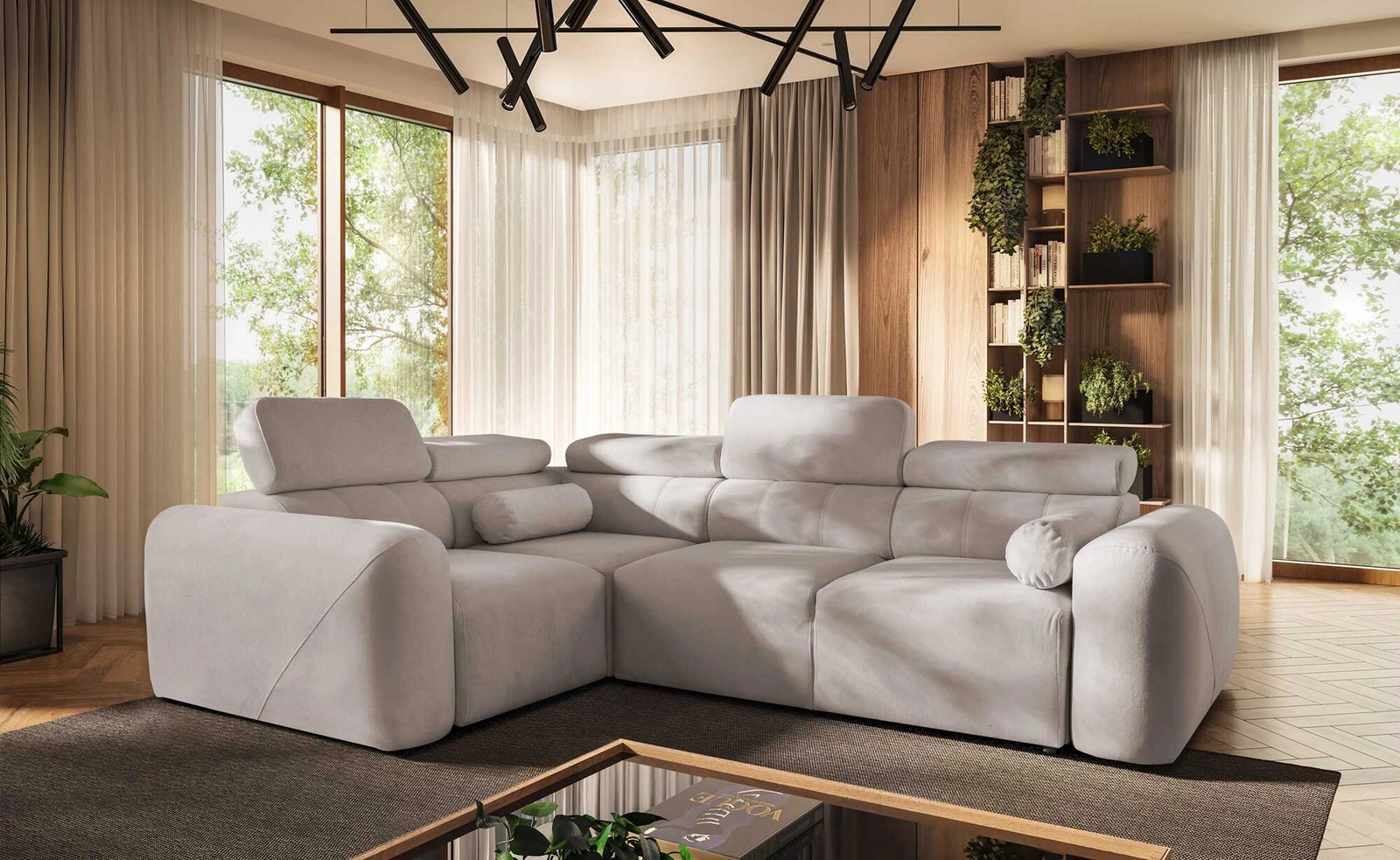 - Narożnik Cantare II cechuje się nowoczesnym i stylowym designem. Powierzchnia narożnika została pokryta miękką, pluszową tkaniną o delikatnej fakturze, która dodaje wnętrzu subtelnego charakteru. Łatwy w obsłudze system rozkładania to kolejny atut bryły.