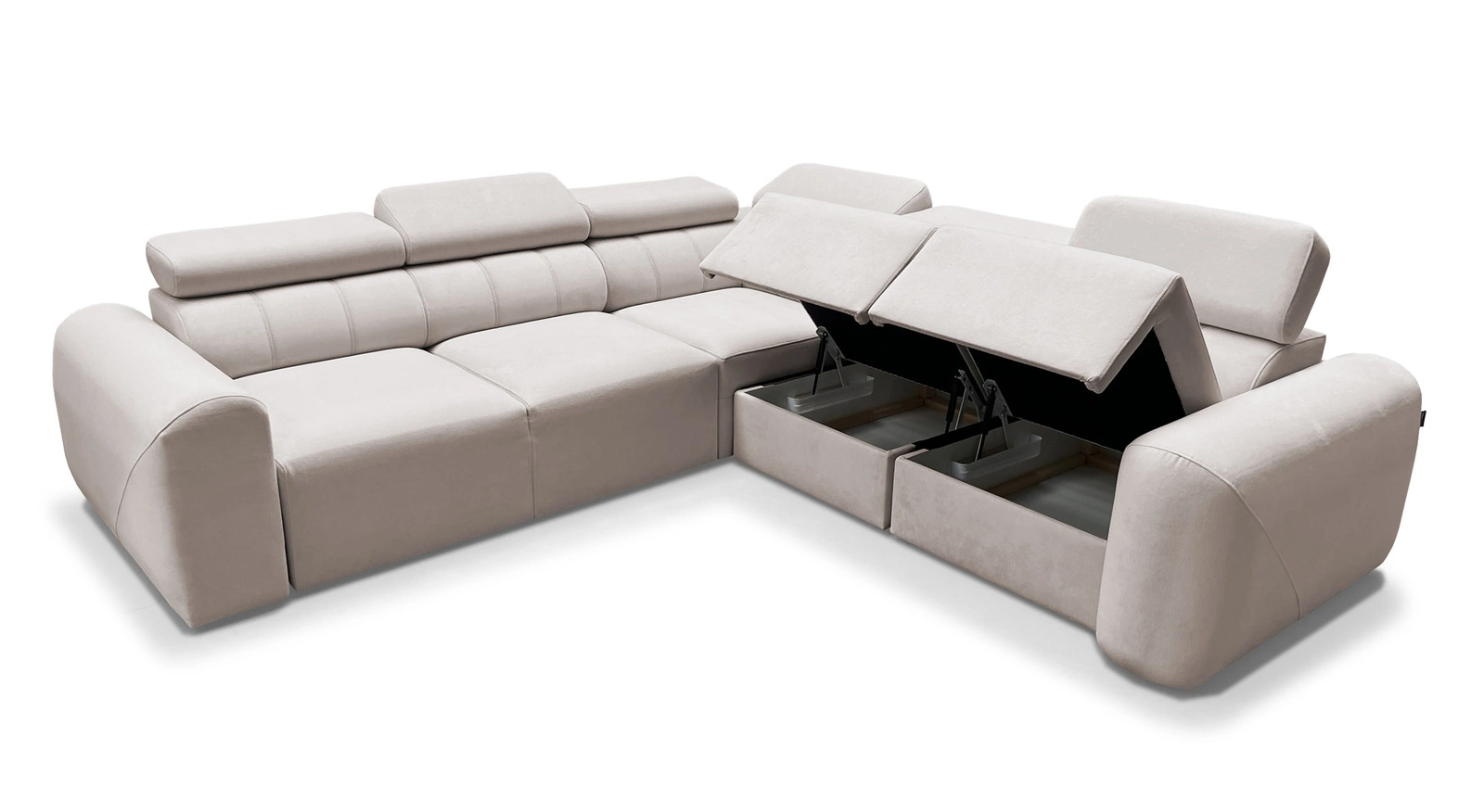 Narożnik z funkcją spania Cantare III beżowy prawostronny komfortowy i stylowy narożnik do salonu dwa pojemniki na pościel