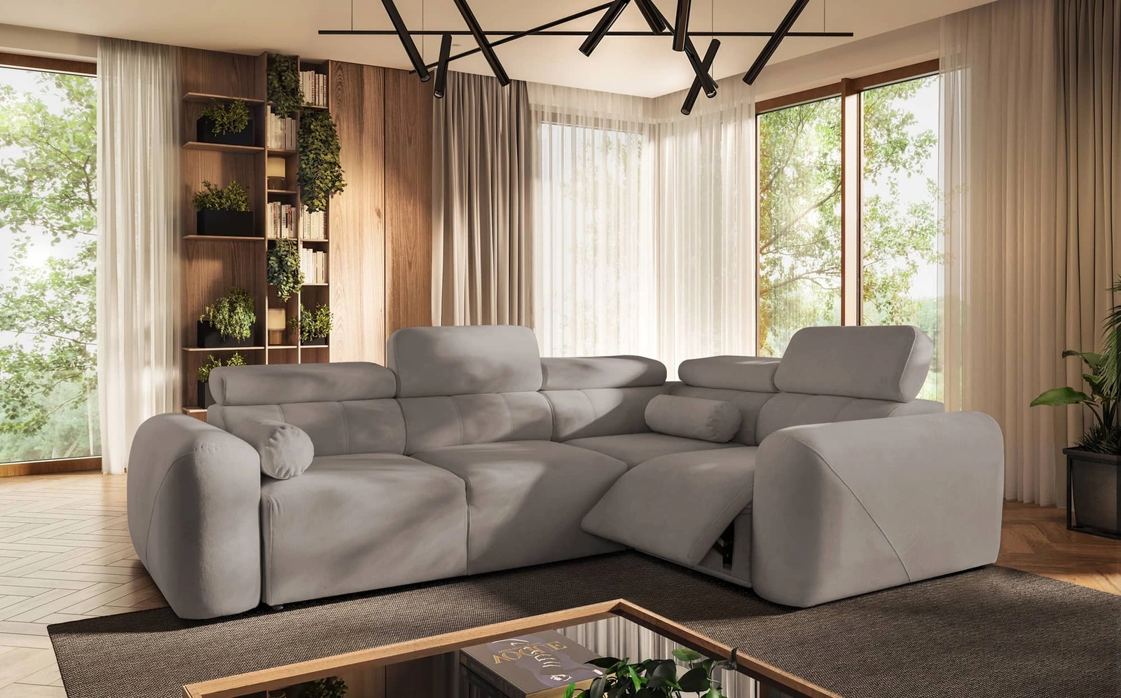 Dodatki tego mebla, które docenią wszyscy użytkownicy to elektrycznie podnoszony podnóżek, regulowane zagłówki oraz funkcja spania.