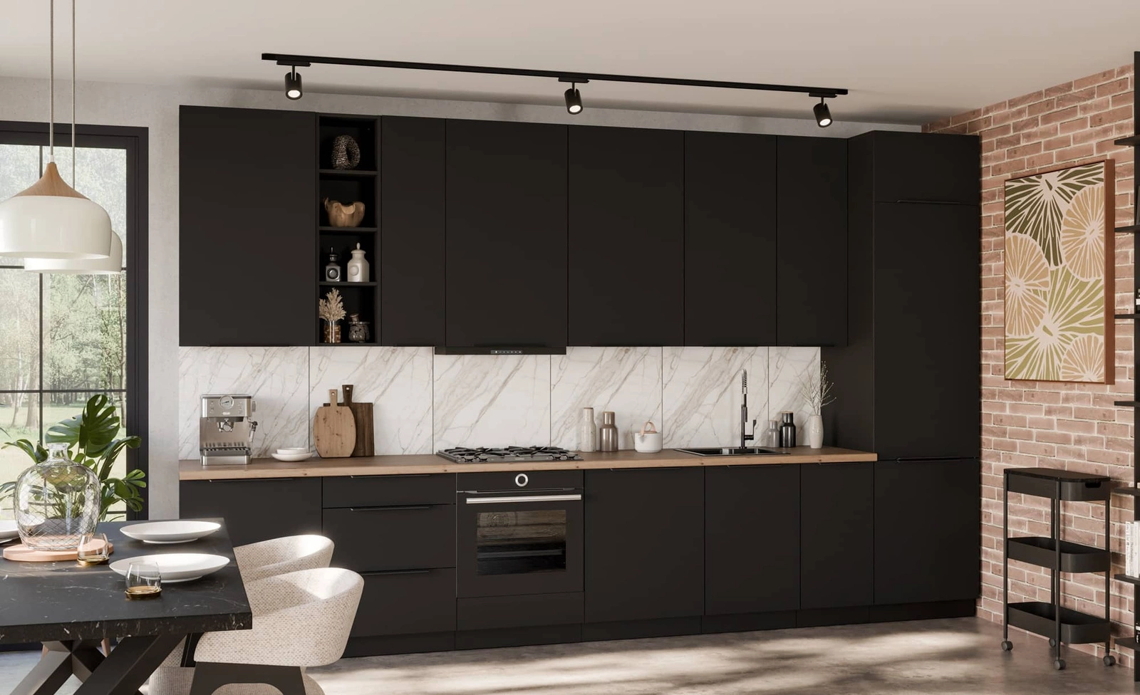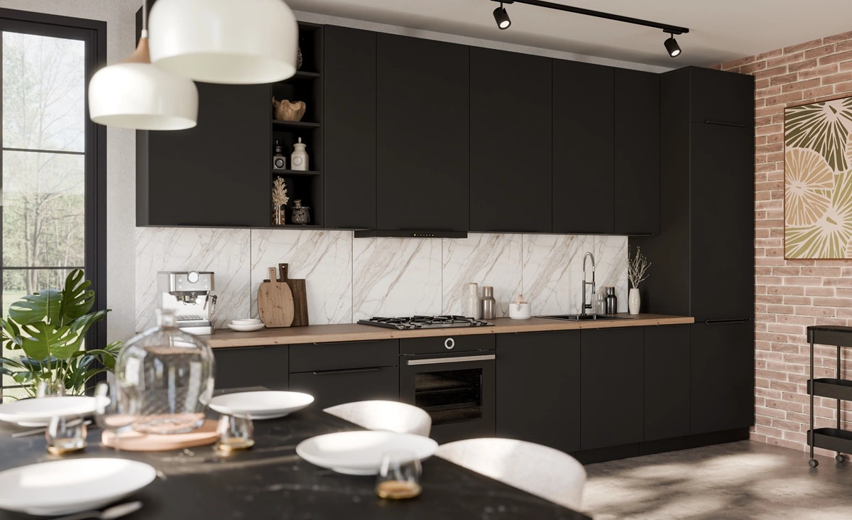 Zestaw mebli kuchennych Alatri Bl w kolorze czarnym to propozycja gotowego zestawu mebli do kuchni, który doskonale prezentuje się w nowoczesnych wnętrzach.