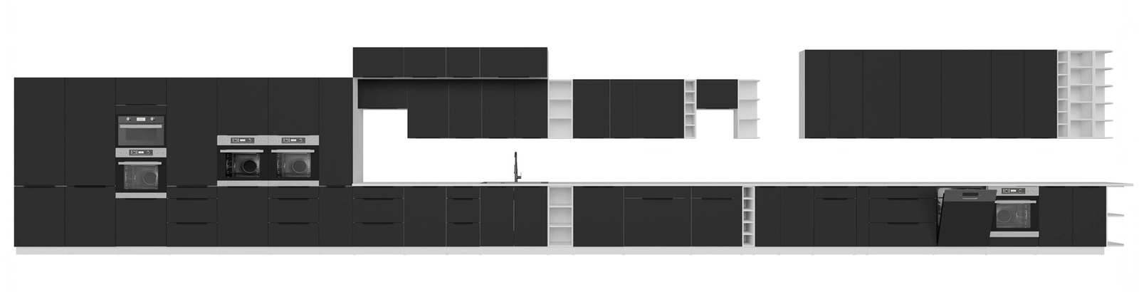 Korpus i fronty szafki kuchennej są wykonane z wysokiej jakości płyty laminowanej o grubości 16 mm. Zaletą tego rodzaju materiałów jest wysoka odporność na wpływ zewnętrznych czynników takich jak para wodna, wysoka temperatura, wilgoć, rozlane ciecze. Użyty materiał jest także odporny na przypadkowe uszkodzenia. Stylowym dopełnieniem frontów szafki kuchennej są czarne, metalowe uchwyty krawędziowe, które poza swoją podstawową funkcją podkreślają również nowoczesny design szafki.