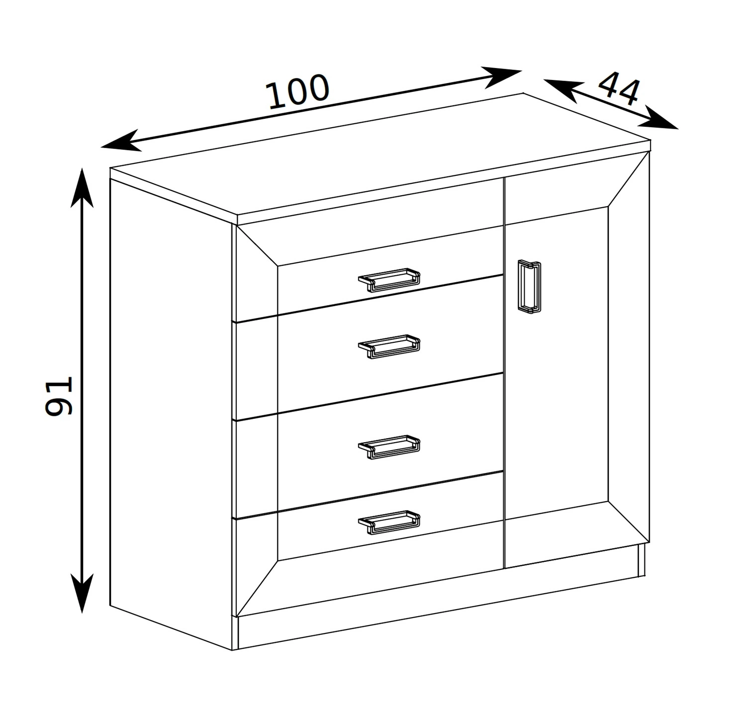 Komoda do salonu skonstruowana jest z 1 drzwi oraz 4 szuflad. Komoda do salonu gwarantuje komfortowe i bezproblemowe korzystanie oraz trwałość całego mebla przez wiele lat użytkowania. Kontrastowa i wyrazista kolorystyka świetnie odnajdzie się w klasycznych aranżacjach, dzięki czemu komoda z szufladami Tade świetnie sprawdzi się w roli komody do salonu lub komody do pokoju dziennego. Komoda z powodzeniem odnajdzie się także jako mebel biurowy lub komoda do sypialni.