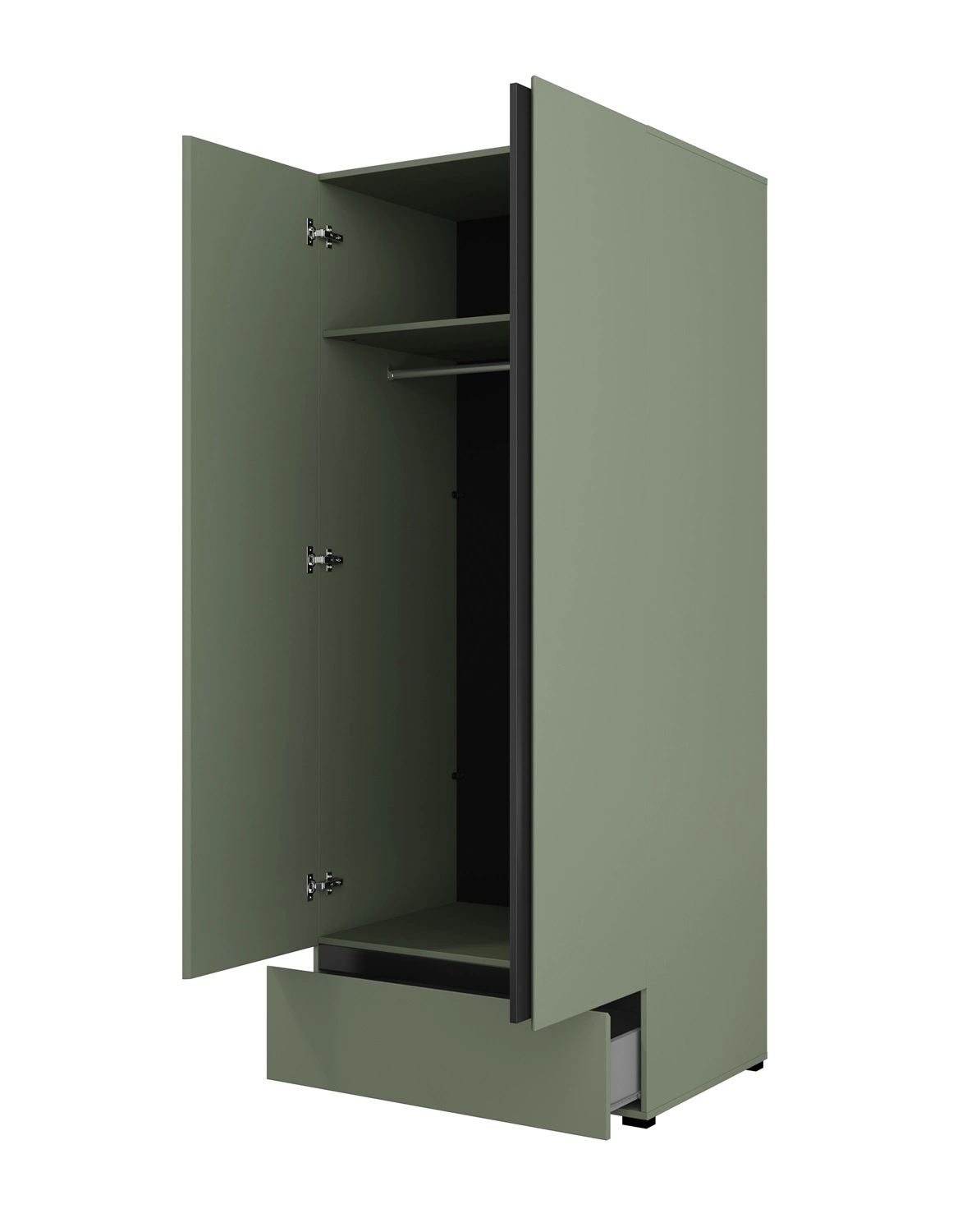 Szafa Cross zachwyci wszystkich miłośników wyrafinowanych aranżacji. Mebel wyróżnia się prostotą oraz elegancją, a także zaskakuje szeroką funkcjonalnością. Oryginalna kolorystyka i geometryczny kształt stworzy niepowtarzalny klimat w każdym wnętrzu. Modna zieleń znakomicie współgra z wstawkami w kolorze czarnym nadając meblom nowoczesnego wyglądu i kontrastu. Takie zestawienie kolorystyczne doskonale oddaje unikatowy charakter szafy. Nietuzinkowym wykończeniem frontów szafy z szufladą są subtelnie frezowane uchwyty.
