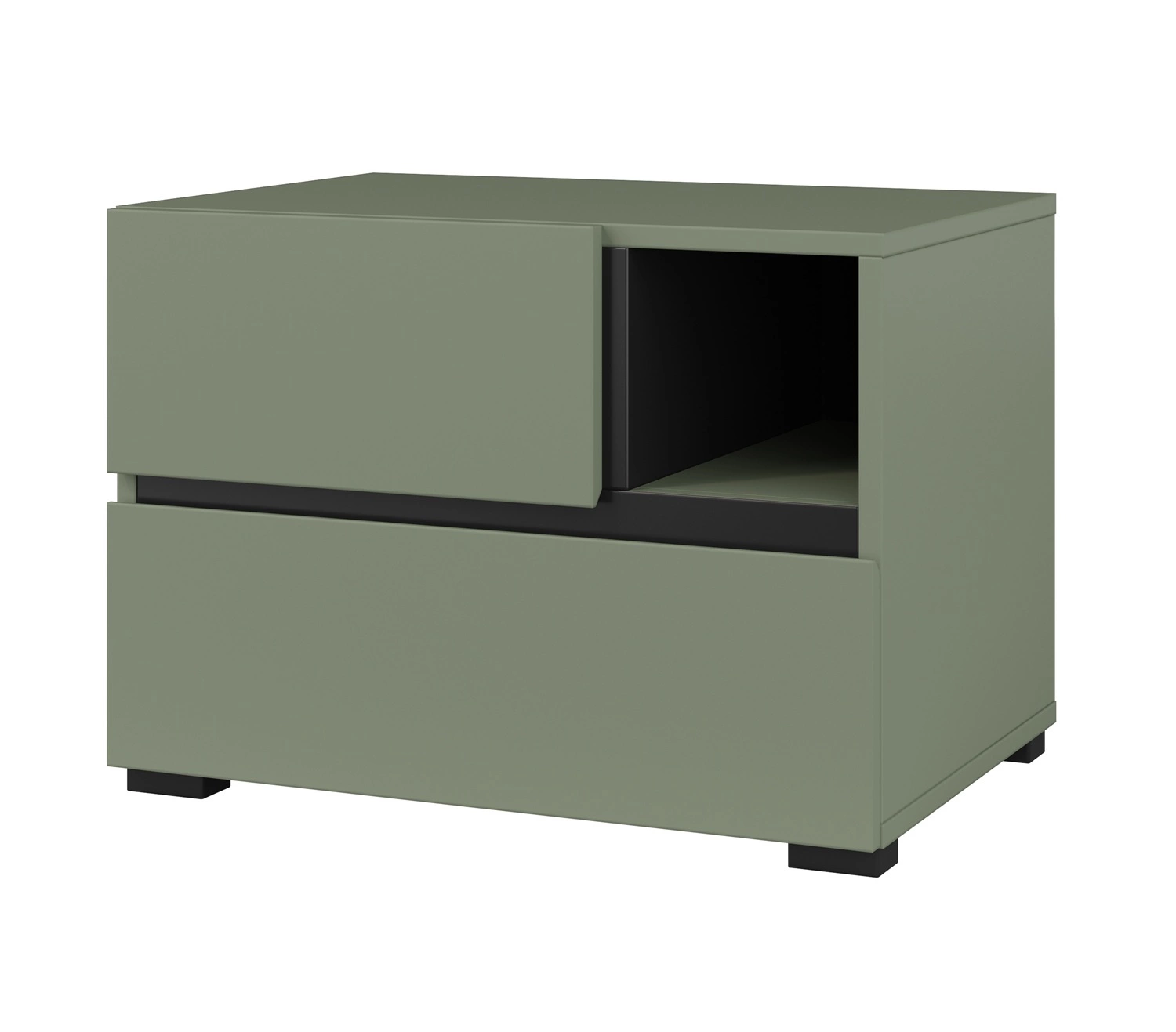 Szafka nocna Cross zachwyci wszystkich miłośników wyrafinowanych aranżacji. Mebel wyróżnia się prostotą oraz elegancją, a także zaskakuje szeroką funkcjonalnością. Oryginalna kolorystyka i geometryczny kształt stworzy niepowtarzalny klimat w każdym wnętrzu. Modna zieleń znakomicie współgra z wstawkami w kolorze czarnym nadając meblom nowoczesnego wyglądu i kontrastu. Takie zestawienie kolorystyczne doskonale oddaje unikatowy charakter szafki nocnej. Nietuzinkowym wykończeniem frontów szafki nocnej z szufladami są subtelnie frezowane uchwyty.