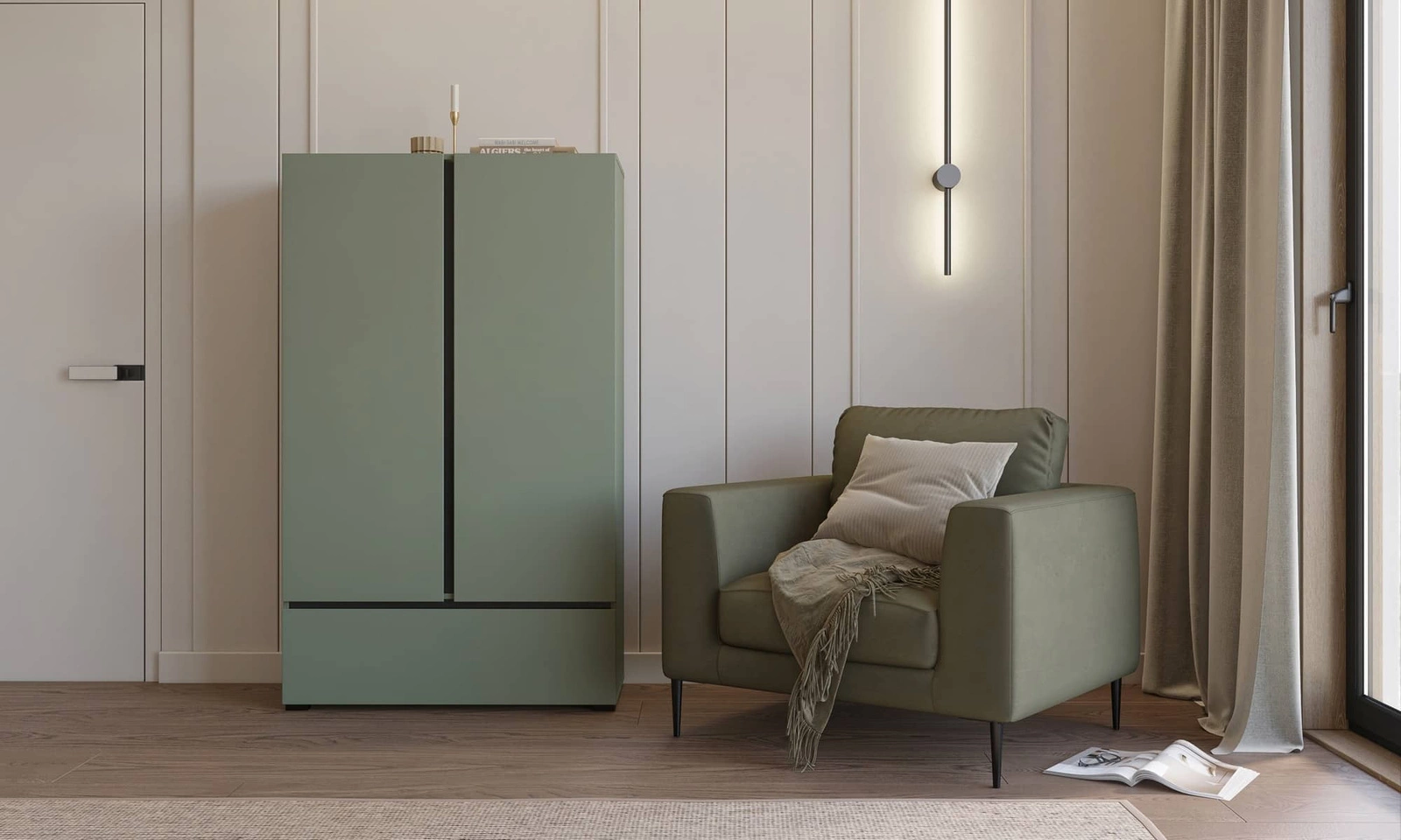 Komoda wysoka Cross 89 cm zielona stylowy design komody z szufladą do sypialni prosta forma w nowoczesnym wydaniu