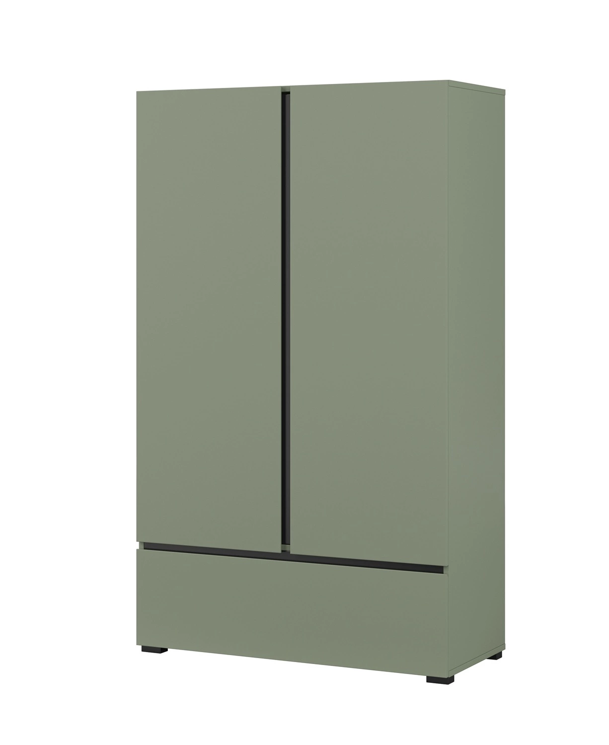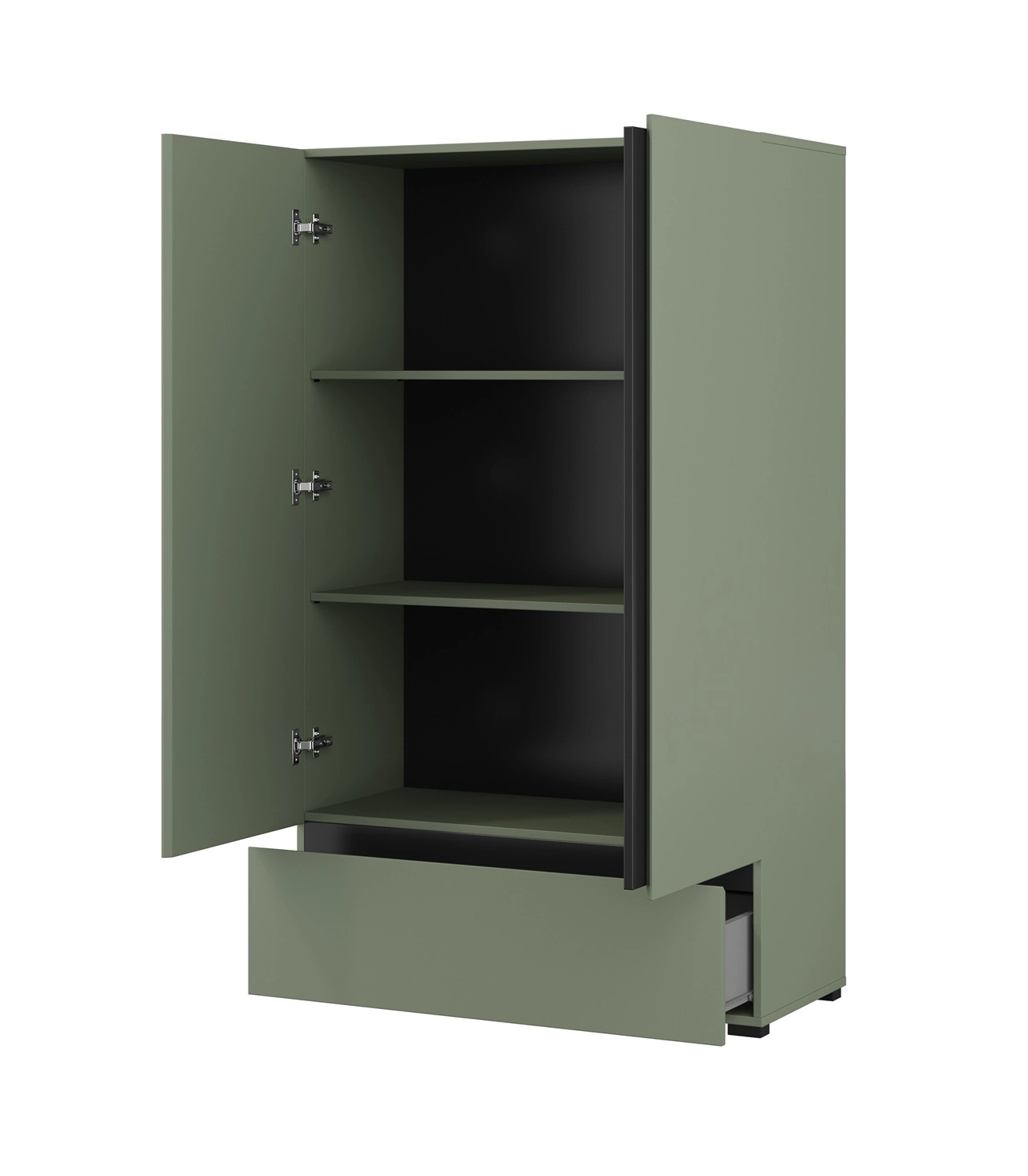 Komoda wysoka Cross zachwyci wszystkich miłośników wyrafinowanych aranżacji. Mebel wyróżnia się prostotą oraz elegancją, a także zaskakuje szeroką funkcjonalnością. Oryginalna kolorystyka i geometryczny kształt stworzy niepowtarzalny klimat w każdym wnętrzu. Modna zieleń znakomicie współgra z wstawkami w kolorze czarnym nadając meblom nowoczesnego wyglądu i kontrastu. Takie zestawienie kolorystyczne doskonale oddaje unikatowy charakter komody. Nietuzinkowym wykończeniem frontów komody z szufladą są subtelnie frezowane uchwyty.