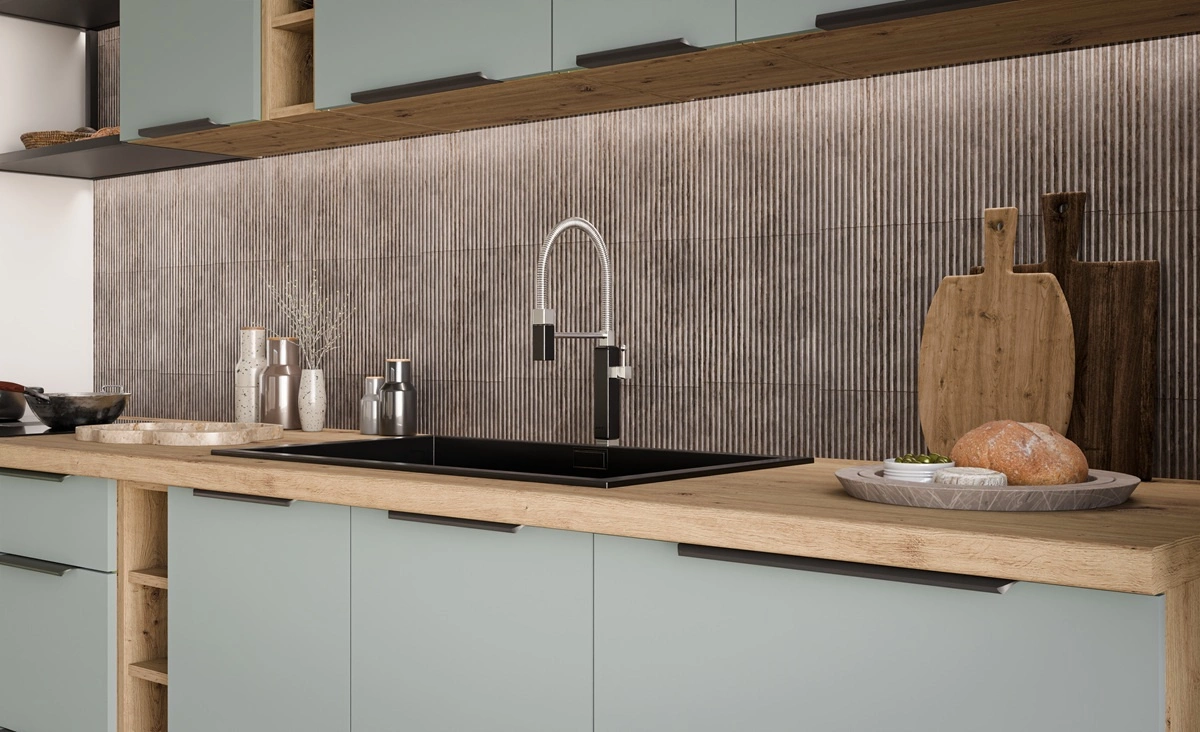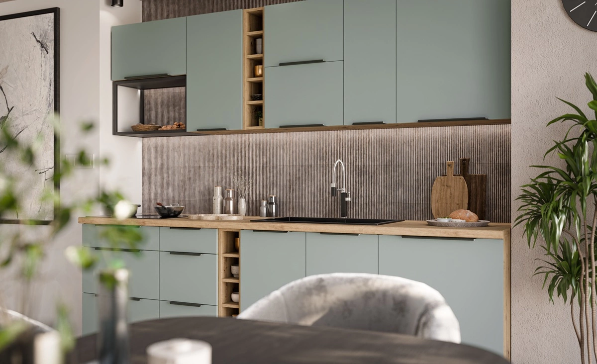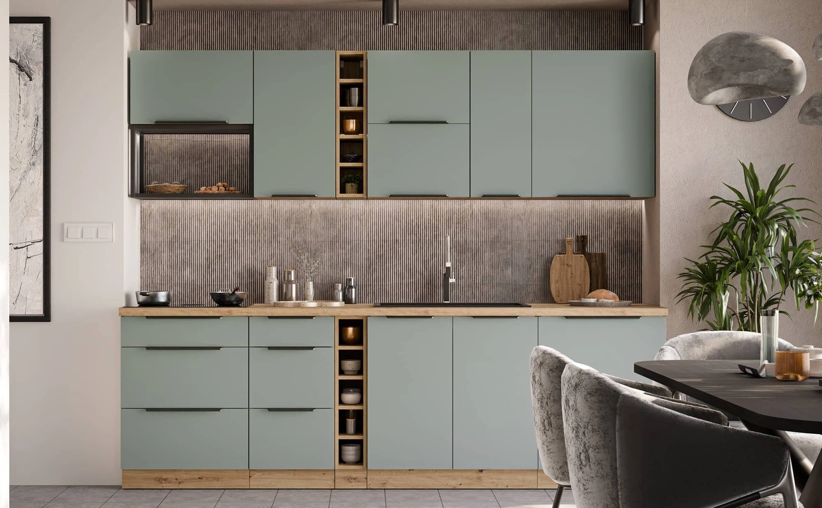 Meble kuchenne z kolekcji Treviso Ar zostały zaprojektowane z myślą o wszystkich, którzy cenią sobie estetykę oraz poszukują funkcjonalnych rozwiązań do swojej kuchni. Połączenie prostych brył, gładkich powierzchni oraz wyjątkowego koloru frontów z eleganckim odcieniem korpusów sprawia, że szafki kuchenne Treviso Ar wpasują się we wnętrze w każdym stylu. Meble kuchenne Treviso Ar charakteryzują się solidną jakością wykonania, a także użytkowym wzornictwem. Dodatkową zaletą mebli kuchennych Treviso Ar są fronty wykonane w innowacyjnej technologii Anti Fingerprint. Użyta w produkcji mebli technologia zapobiega powstawaniu widocznych śladów dotyku oraz innych zabrudzeń pozwalając zachować perfekcyjny wygląd szafki kuchennej na lata. Meble modułowe do kuchni to produkty wykonane w trosce o komfort podczas codziennego użytkowania i długoletni, elegancki wygląd.