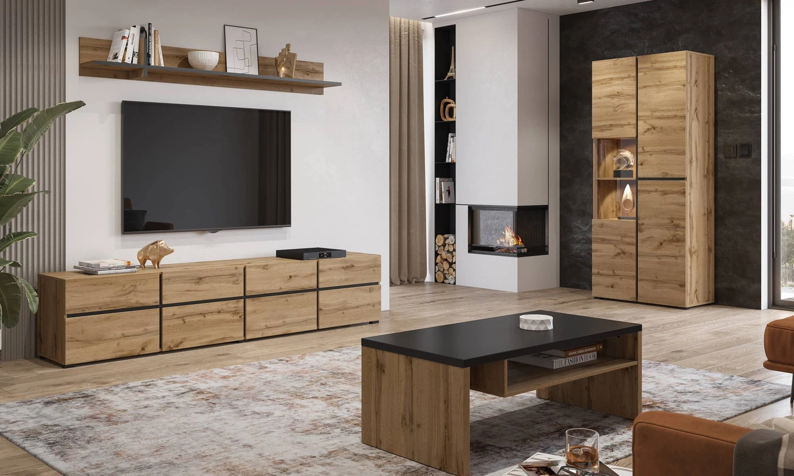 Półka Cross zachwyci wszystkich miłośników wyrafinowanych aranżacji. Mebel wyróżnia się prostotą oraz elegancją, a także zaskakuje szeroką funkcjonalnością. Oryginalna kolorystyka stworzy niepowtarzalny klimat w każdym wnętrzu. Ciepły odcień dębu wotan znakomicie współgra z wstawkami w kolorze czarnym nadając meblom nowoczesnego wyglądu i kontrastu. Takie zestawienie kolorystyczne doskonale oddaje unikatowy charakter półki. Półka pozwoli subtelnie wyeksponować dodatki. Obecność półki wiszącej stanie się stylowym wykończeniem salonu oraz nada mu szczególnego charakteru.