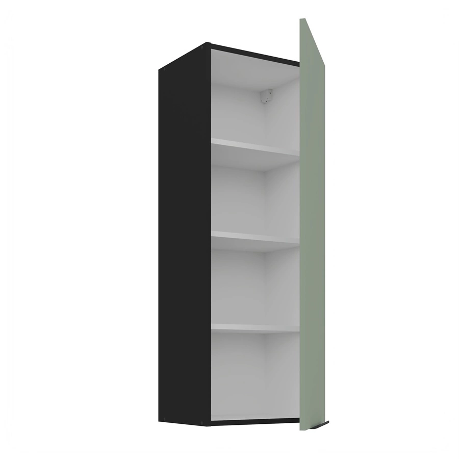 Trzy półki szafki kuchennej można wyciągnąć i uzyskać miejsce na wysokie przedmioty. Drzwi są uniwersalne i można je zamontować po prawej lub po lewej stronie. Standardowym wyposażeniem szafki kuchennej są zawiasy z systemem cichego domykania. Spowalniacze zwiększają komfort i bezpieczeństwo użytkowania mebli.