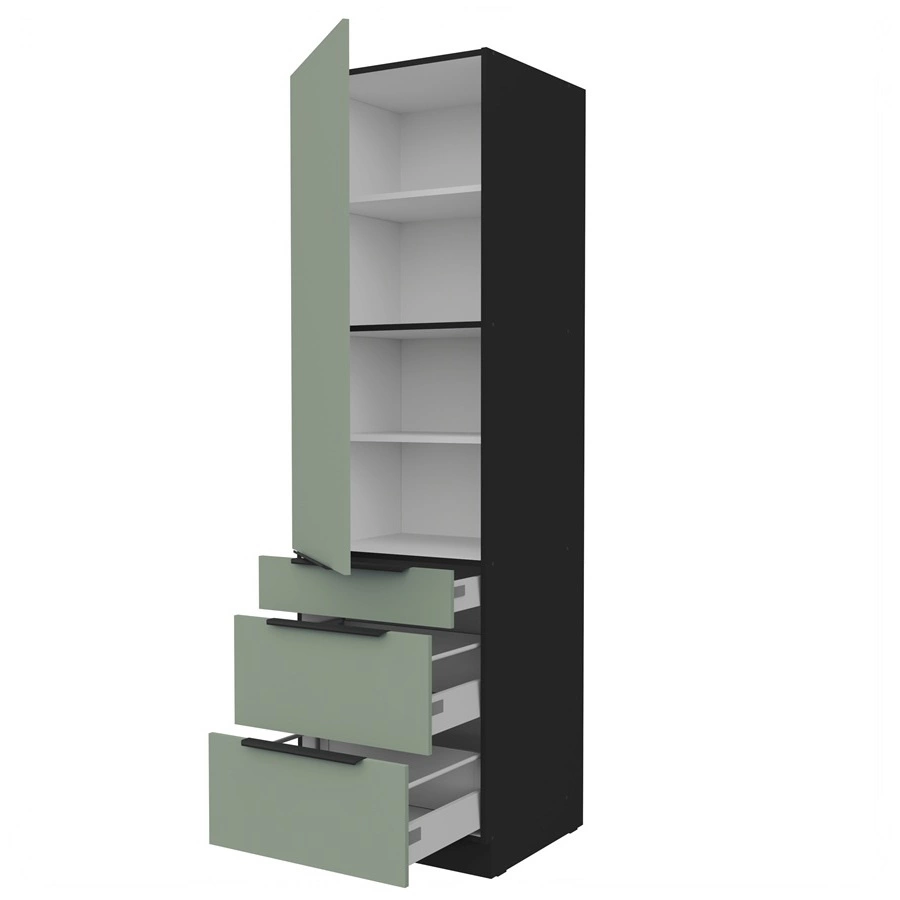 Górna część słupka kuchennego została wyposażona w półki, które posiadają trzystopniową regulację wysokości. Dolna część została wyposażona w 3 szuflady wykonane w technologii Premium Box. Szuflady słupka kuchennego Premium Box charakteryzują się zwiększoną wytrzymałością, dzięki czemu szafkę kuchenną można wypełnić po brzegi przyborami i akcesoriami kuchennymi. Drzwi szafki kuchennej są uniwersalne i można je zamontować po prawej lub po lewej stronie. Standardowym wyposażeniem szafki kuchennej są szuflady oraz zawiasy z systemem cichego domykania. Spowalniacze zwiększają komfort i bezpieczeństwo użytkowania mebli.