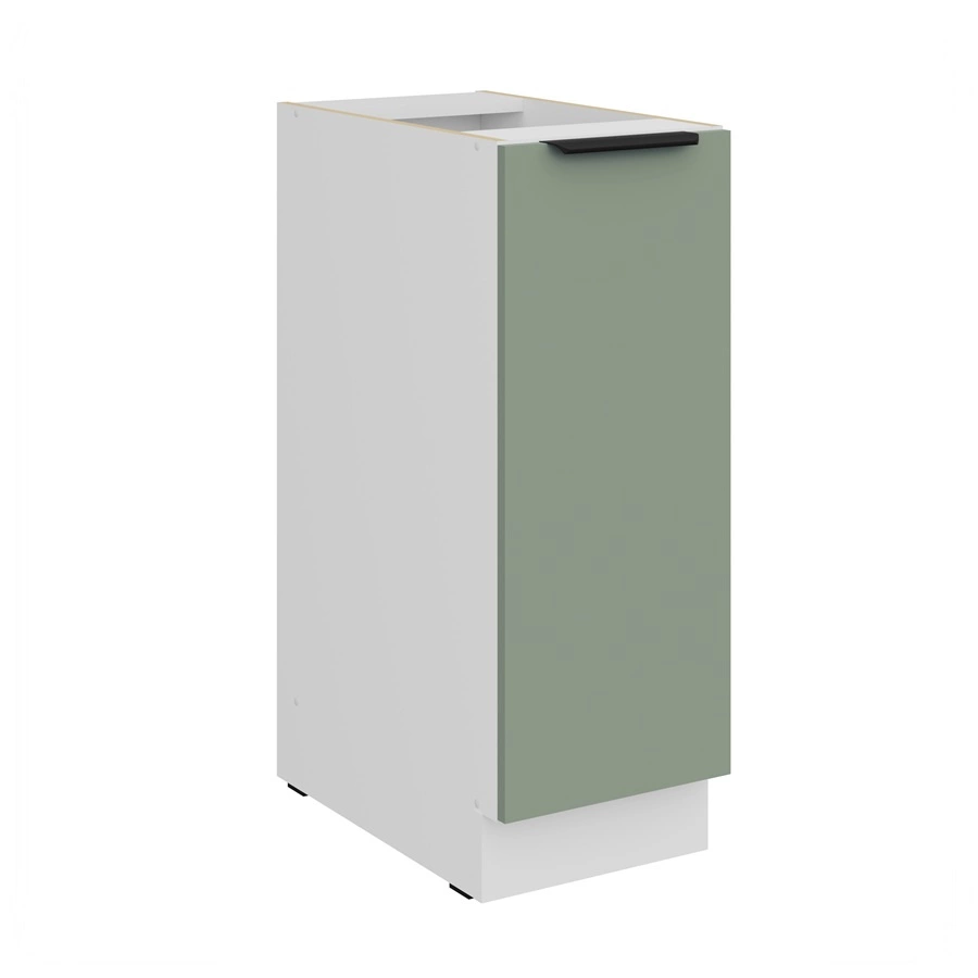 Korpus i fronty szafki kuchennej są wykonane z wysokiej jakości płyty laminowanej o grubości 16 mm. Zaletą tego rodzaju materiałów jest wysoka odporność na wpływ zewnętrznych czynników takich jak para wodna, wysoka temperatura, wilgoć, rozlane ciecze. Użyty materiał jest także odporny na przypadkowe uszkodzenia. Stylowym dopełnieniem frontów szafki kuchennej jest czarny, metalowy uchwyt krawędziowy, który poza swoją podstawową funkcją podkreśla również nowoczesny design szafki.