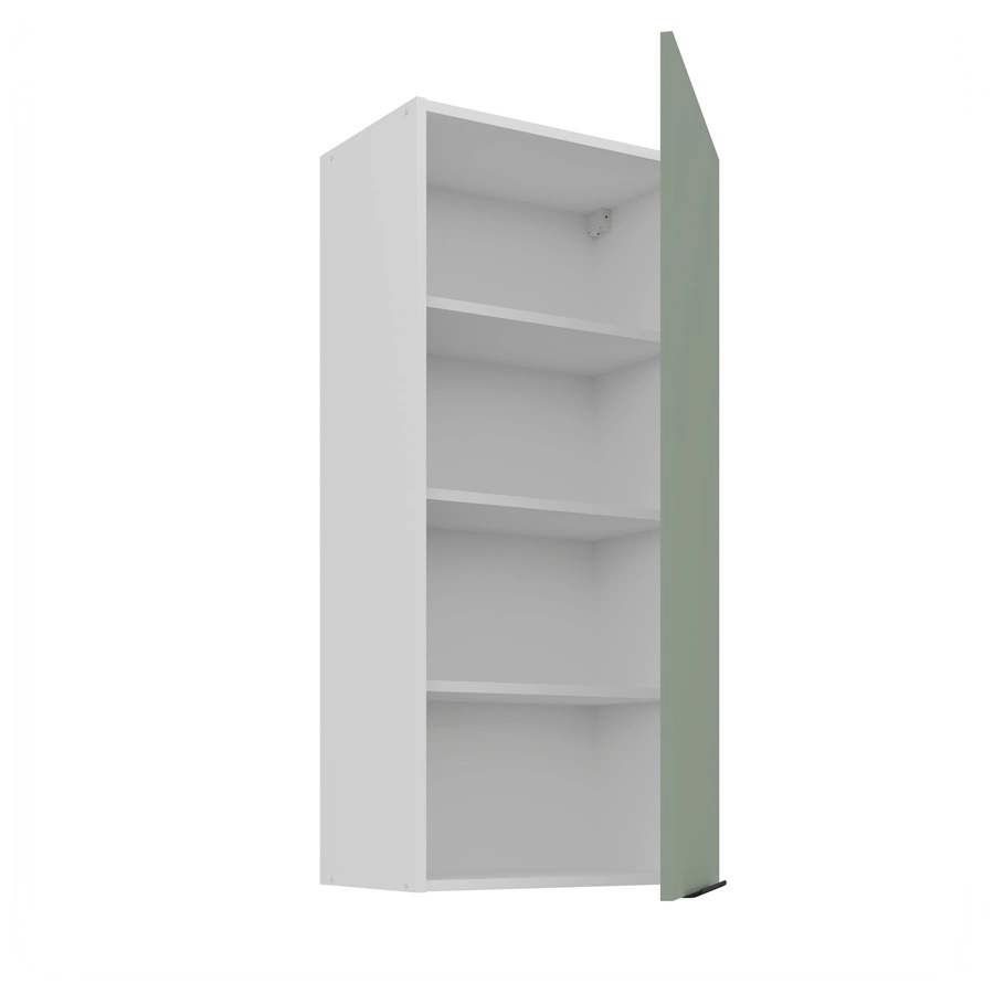 Trzy półki szafki kuchennej można wyciągnąć i uzyskać miejsce na wysokie przedmioty. Drzwi są uniwersalne i można je zamontować po prawej lub po lewej stronie. Standardowym wyposażeniem szafki kuchennej są zawiasy z systemem cichego domykania. Spowalniacze zwiększają komfort i bezpieczeństwo użytkowania mebli.