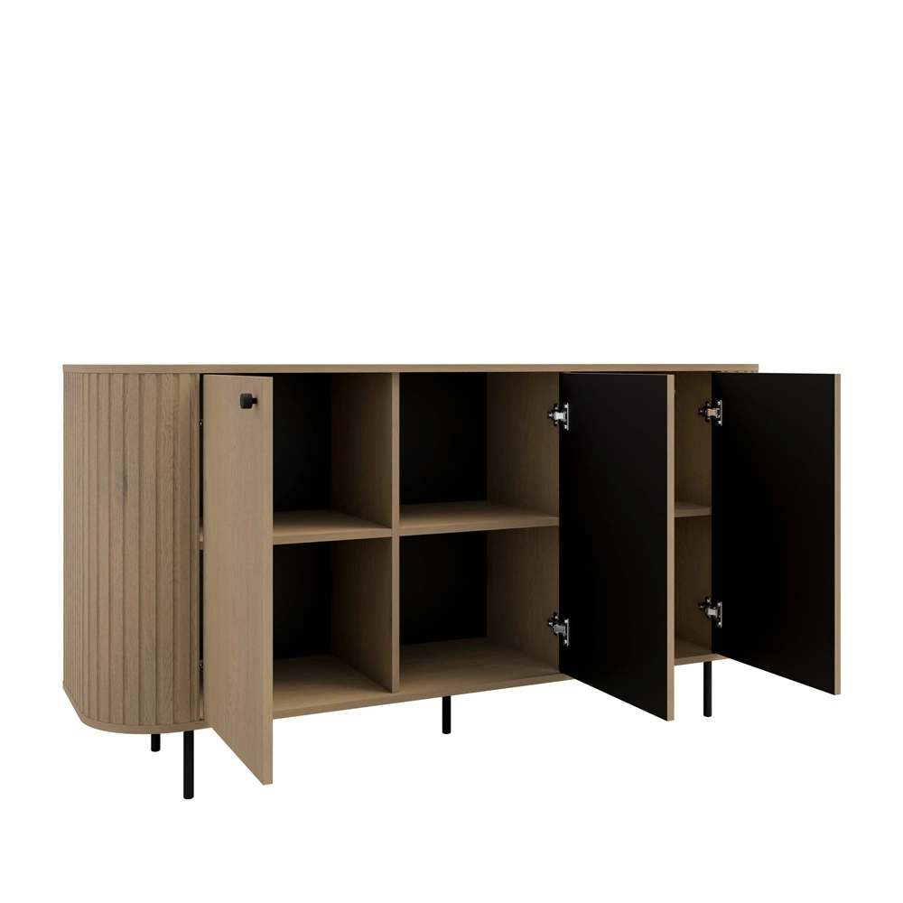 Komoda Ovalio to wyjątkowy mebel, w którym nowoczesny design spotyka się z subtelną elegancją. Obłe kształty i miękkie linie urozmaicone starannymi frezami wprowadzą do wnętrza lekkość, spokój oraz harmonię tworząc ponadczasową aranżację. Naturalna kolorystyka dębu cremona została wzbogacona o czarne, metalowe akcenty przełamujące jasną tonację komody, jednocześnie nieprzytłaczające lekkiej formy bryły. Komoda do salonu Ovalio to idealny wybór dla osób ceniących estetykę, funkcjonalność i ponadczasowy styl.