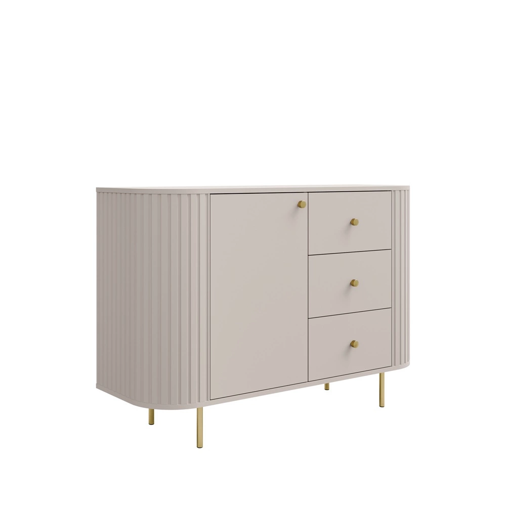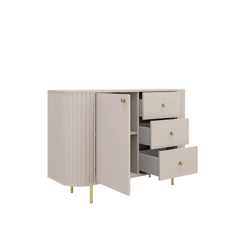 Komoda z szufladami Ovalio to wyjątkowy mebel, w którym nowoczesny design spotyka się z subtelną elegancją. Obłe kształty i miękkie linie urozmaicone starannymi frezami wprowadzą do wnętrza lekkość, spokój oraz harmonię tworząc ponadczasową aranżację. Modny beżowy kolor w piaskowym odcieniu został wzbogacony o złote, metalowe akcenty przełamujące jasną tonację komody, jednocześnie nieprzytłaczające lekkiej formy bryły. Komoda do salonu Ovalio to idealny wybór dla osób ceniących estetykę, funkcjonalność i ponadczasowy styl.