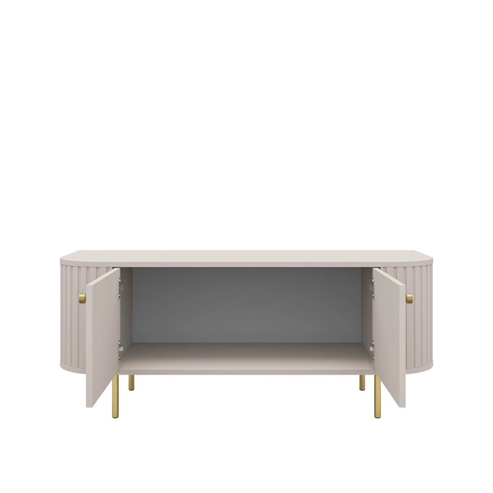 Szafka pod telewizor Ovalio to wyjątkowy mebel, w którym nowoczesny design spotyka się z subtelną elegancjąObłe kształty i miękkie linie urozmaicone starannymi frezami wprowadzą do wnętrza lekkość, spokój oraz harmonię tworząc ponadczasową aranżację. Modny beżowy kolor w piaskowym odcieniu został wzbogacony o złote, metalowe akcenty przełamujące jasną tonację szafki RTV, jednocześnie nieprzytłaczające lekkiej formy bryły. Szafka pod telewizor Ovalio to idealny wybór dla osób ceniących estetykę, funkcjonalność i ponadczasowy styl.