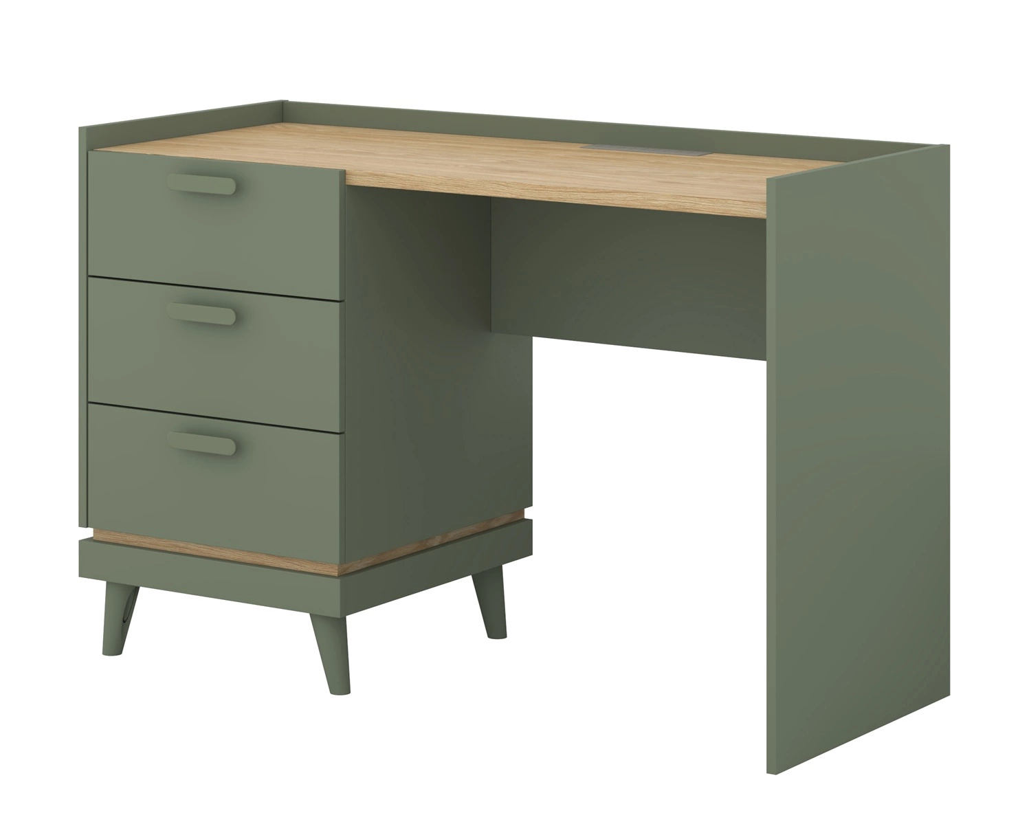 Biurko z szufladami z kolekcji Scandia jest idealnym wyborem dla miłośników nowoczesnych aranżacji o eleganckim charakterze, dla których ważna jest również szeroka funkcjonalność mebla. Modna zieleń harmonijnie łączy się z delikatnie obniżonym blatem w odcieniu dąb olejowany nadając meblom wyjątkowego wyglądu i niepowtarzalnego charakteru. Takie zestawienie kolorystyczne doskonale oddaje unikatowy charakter biurka. Elementem przyciągającym wzrok jest uchwyt o niebanalnym kształcie, który podkreśla elegancki charakter bryły. Konstrukcję mebla urozmaicono nogami wykonanych z wytrzymałego tworzywa sztucznego.