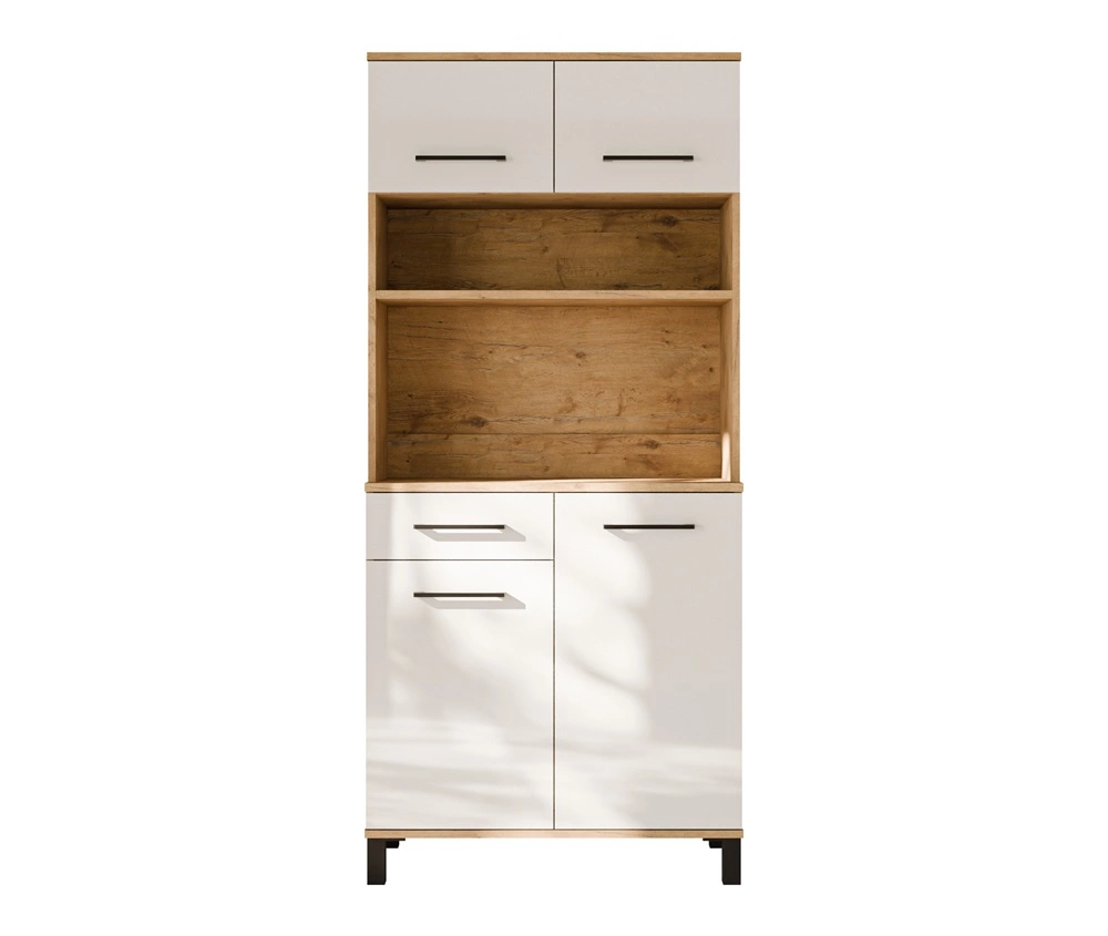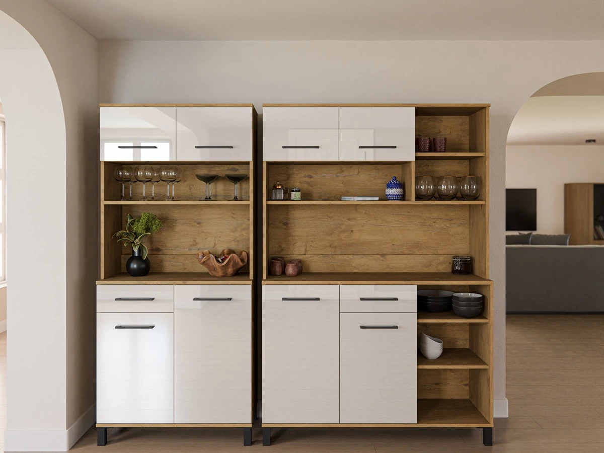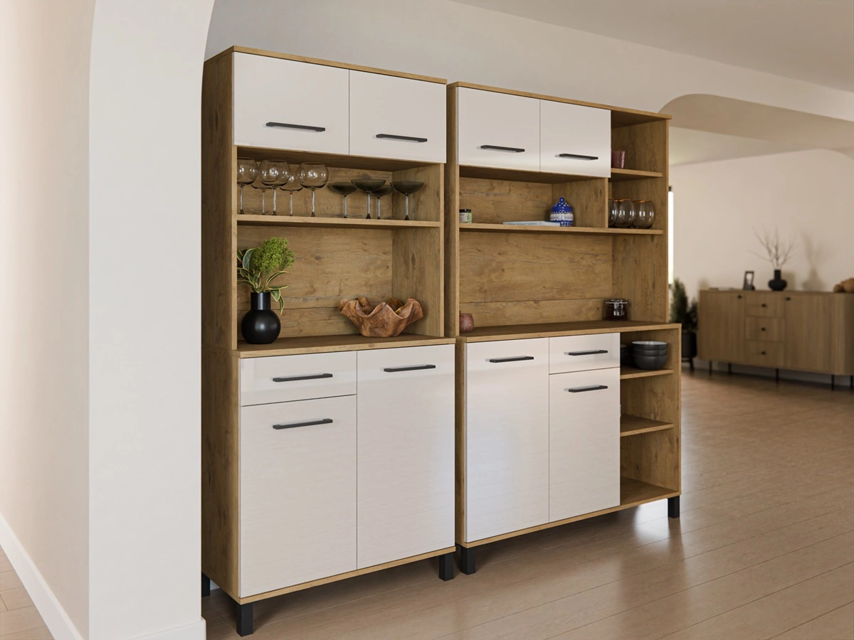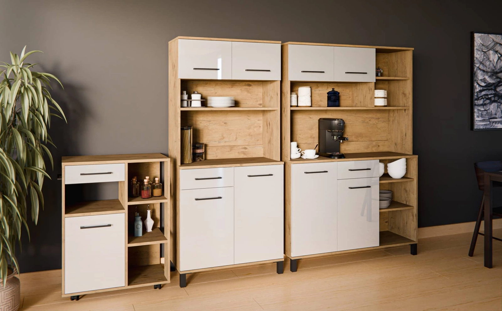 Kredens kuchenny Vento z wytrzymałym blatem, półkami oraz zamykanymi szafkami doskonale odnajdzie się we wnętrzu każdej kuchni. Modna kolorystyka oraz wykończenie frontów w połysku nada wnętrzu szczególnego charakteru i estetycznego wyglądu. Prosta konstrukcja sprawia, że bufet kuchenny dopasuje się do kuchni o minimalistycznym wykończeniu, jak i kuchni w nowoczesnej aranżacji. Nietuzinkowym wykończeniem frontów szafek są metalowe uchwyty w kolorze czarnym. Kredens do kuchni Vento to doskonała propozycja dla osób pragnących zaaranżować niewielki aneks kuchenny w mieszkaniu lub domku na działce.