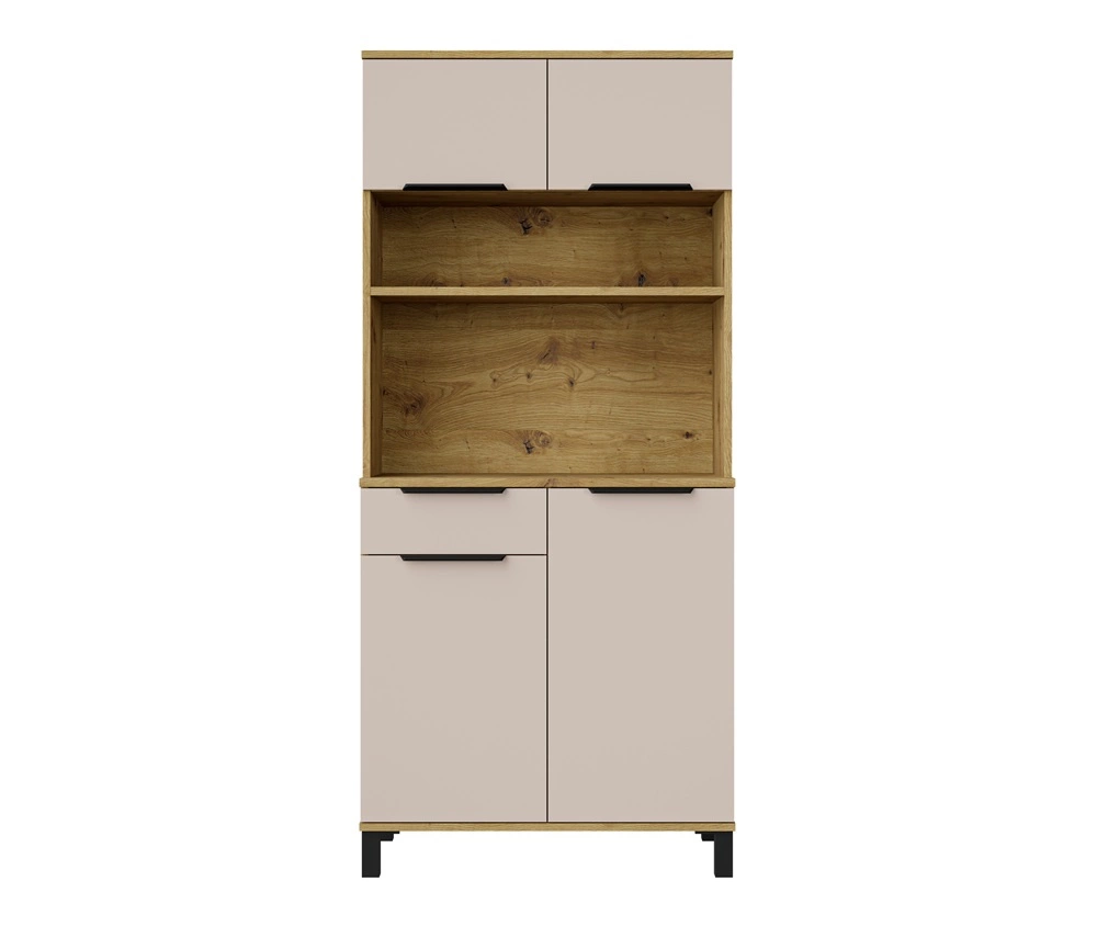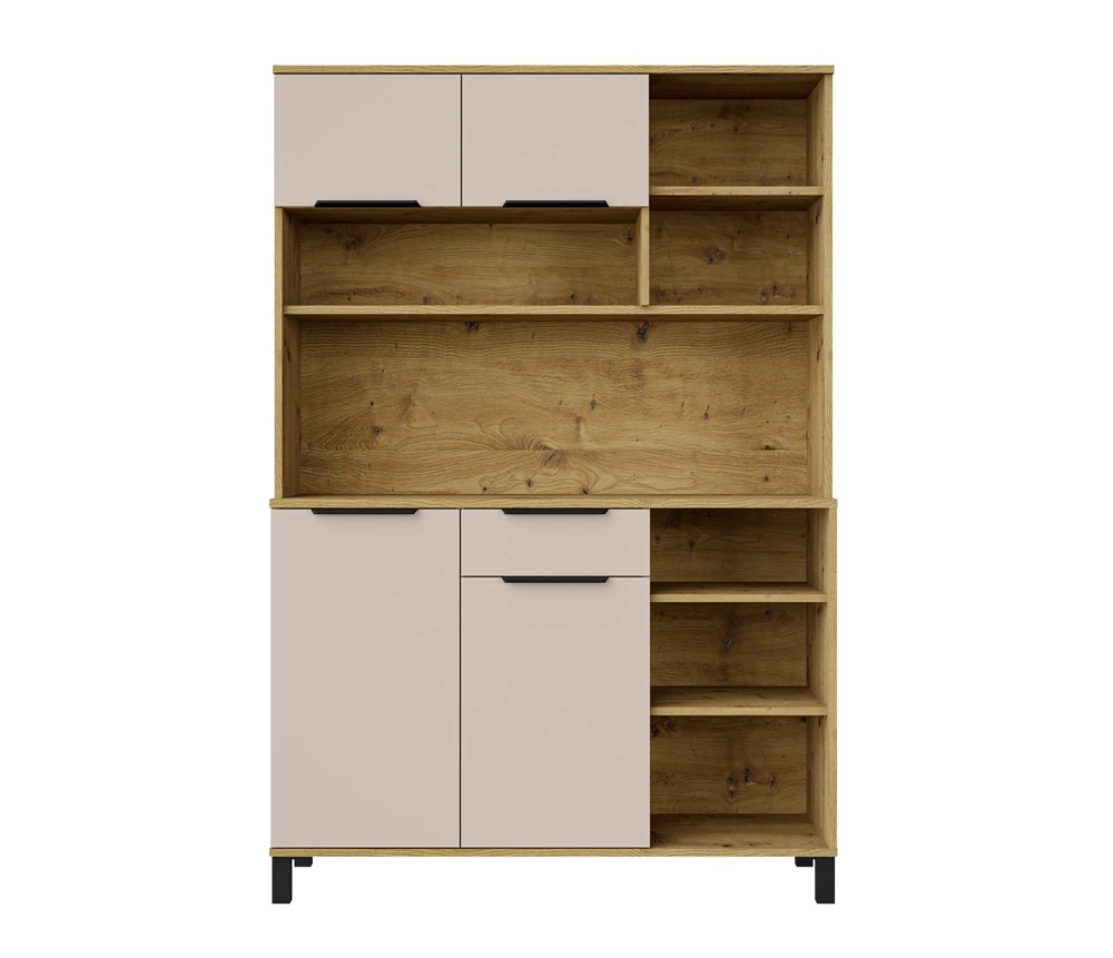 Korpus oraz fronty mebli kuchennych są wykonane z wysokiej jakości płyty laminowanej o grubości 16 mm, obrzeża są zabezpieczone okleiną ABS. Fronty wykazują wysoką wytrzymałość na działanie wilgoci oraz przypadkowe uszkodzenia. Wytrzymały blat, a także półki w kolorze dąb artisan zostały wykonane z płyty laminowanej o grubości 18mm. Kredens kuchenny z kolekcji Soela jest zapakowany w bezpieczny sposób i posiada komplet okuć (wkrętów, śrub, kołków, zawiasów, uchwytów).