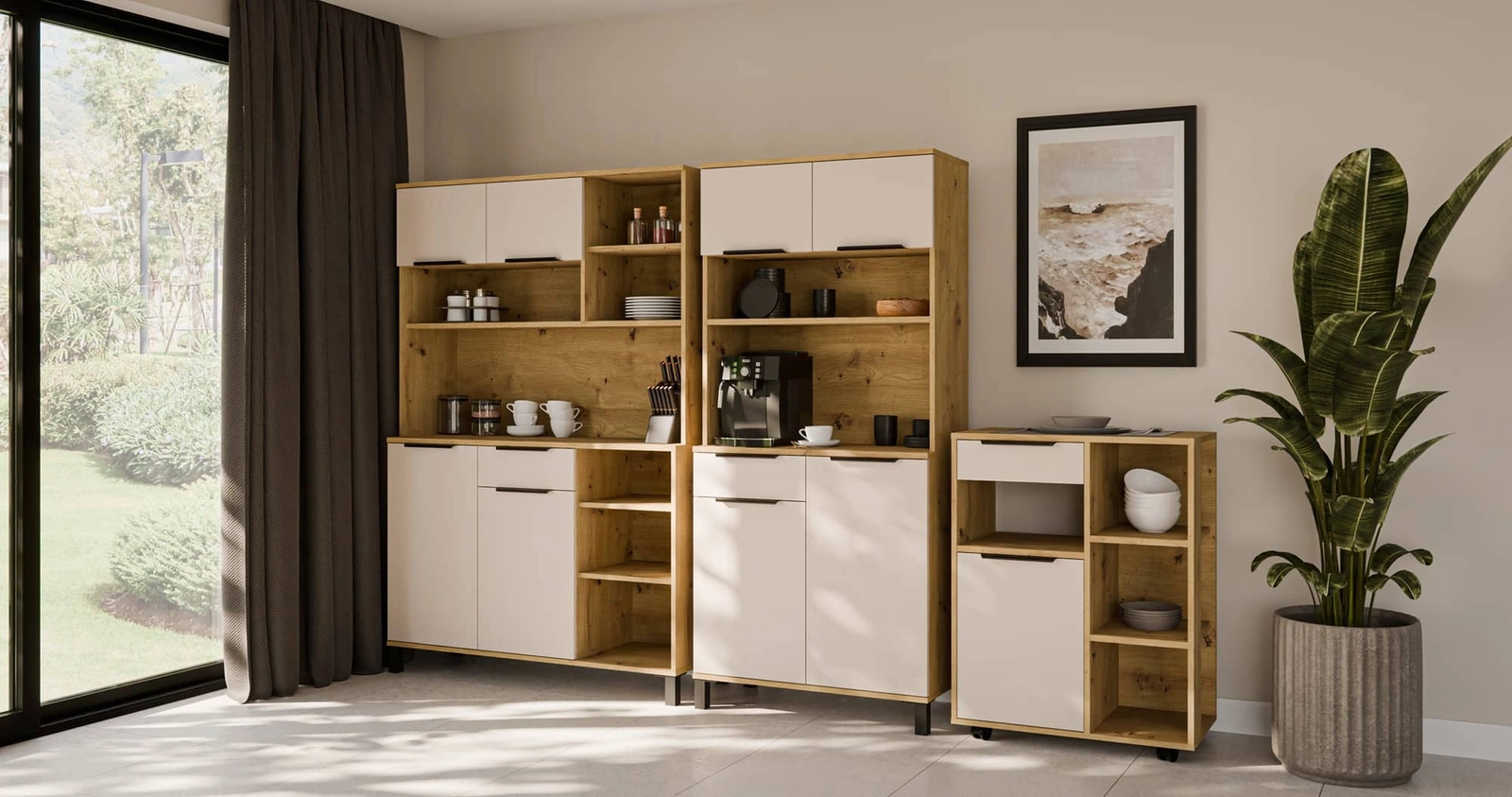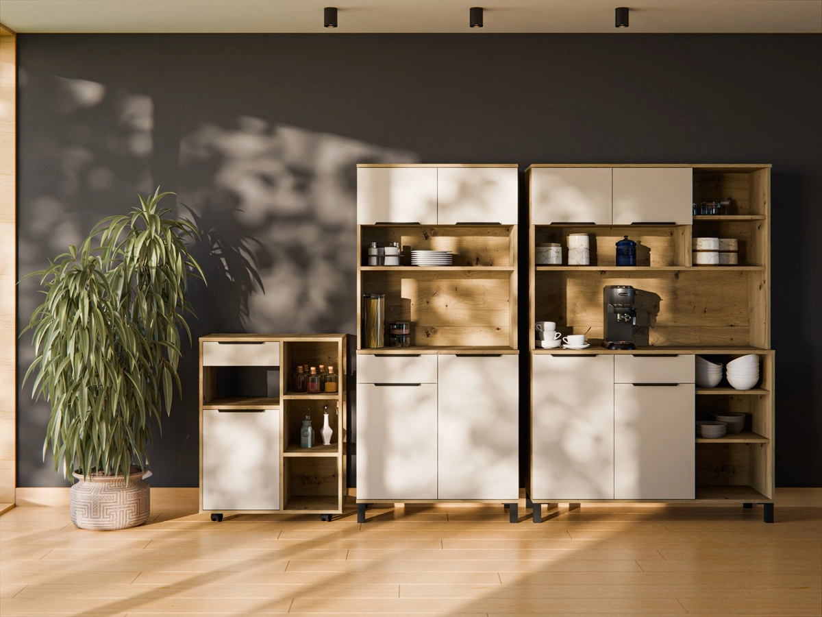 Zestaw mebli kuchennych z wytrzymałym blatem doskonale odnajdzie się we wnętrzu każdej kuchni. Modna kolorystyka oraz gładkie wykończenie frontów nada wnętrzu szczególnego charakteru i estetycznego wyglądu. Prosta konstrukcja sprawia, że zestaw mebli kuchennych wpiszę się do kuchni o minimalistycznym wykończeniu, jak i kuchni w nowoczesnej aranżacji. Nietuzinkowym wykończeniem frontów szafek są metalowe uchwyty krawędziowe w kolorze czarnym. Zestaw mebli kuchennych Soela jest utworzony z szafki kuchennej na kółkach oraz dwóch kredensów. Kredensy do kuchni to doskonała propozycja dla osób pragnących zaaranżować niewielki aneks kuchenny w mieszkaniu lub domku na działce. Wózek kuchenny jest wyposażony w kółka, dzięki czemu można go umieścić w dowolnym miejscu.